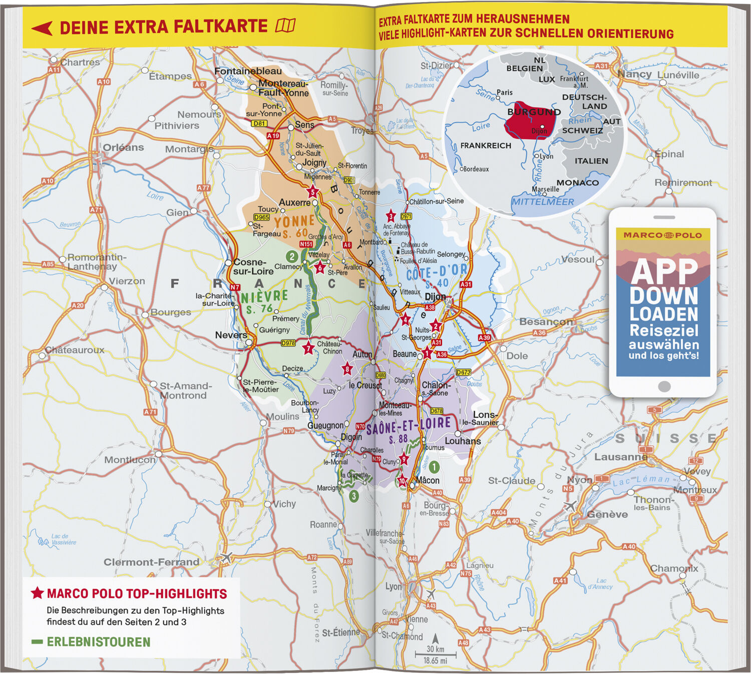 Urlaub im Herzen Frankreichs: Mit dem MARCO POLO Reiseführer durch Burgund Alles nur burgunderrot? In den Weinkellern der Region mag das vielleicht stimmen, aber draußen in der Natur hat Burgund den ganzen Farbkasten zu bieten: Das satte Grün der Hügel kontra...