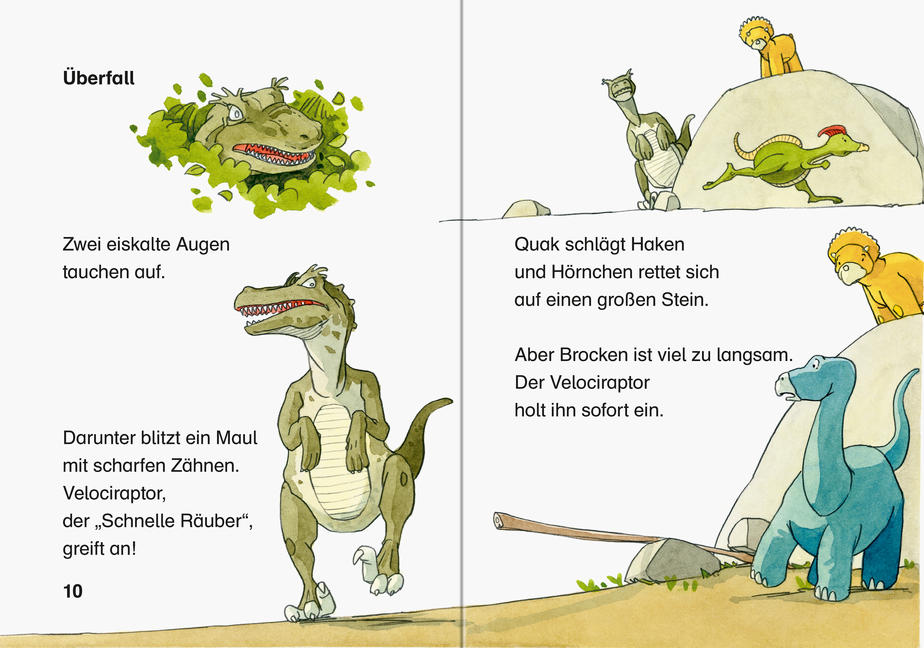 Sie leben im Urzeitwald und sie leben gefährlich: die Dino-Kinder Quak, Brocken und Hörnchen. Diesmal hat es ein besonders übellauniger Bursche auf sie abgesehen: ein hungriger T-Rex! Lesen lernen wie im Flug! Die Kinderbücher der Reihe Leserabe - 1. Lesestufe...