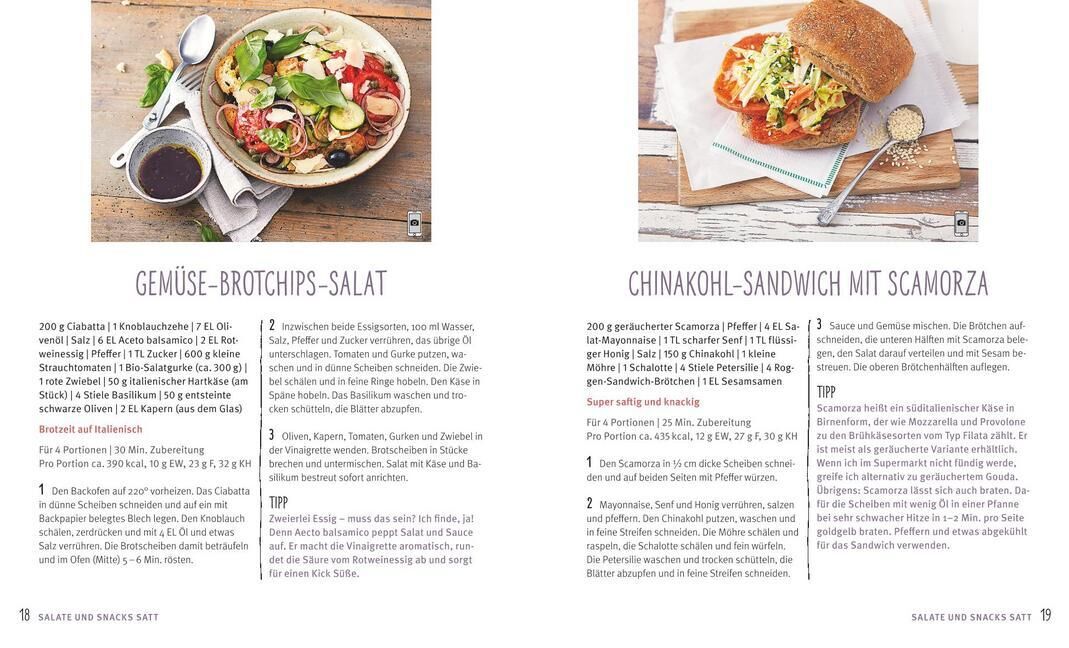 Die Zauberformel dafür? Ist ganz einfach: Aller guten Dinge sind drei! Man braucht für die leichten vegetarischen Rezepte nur Pfanne, Topf oder Auflaufform - drei Dinge, die jeder im Haushalt hat. Und genau so sind auch die Kapitel des Buches aufgebaut: ein Kapitel widmet sich den leichten Rezepten für die Pfanne, eines den schnellen Rezepten für den Topf und eines den einfachen Rezepten für die Auflaufform. Den Anfang machen die schnellen Salate und Snacks, zum Beispiel Couscous-Salat mit Fenchel oder Thai-Gemüsesalat. Dann folgt das Kapitel "Querbeet aus Wok und Pfanne" für superleichte Pfannengerichte, zum Beispiel Spitzkohl-Schmarren. Das Kapitel "Vielfalt aus dem Topf" zeigt, wie Eintopfgerichte heute zu super yummy werden, und zwar ganz ohne Fisch und Fleisch. Und wer kann zu einem Gericht wie dem fluffigen Spätzle-Topf schon nein sagen? Und im Kapitel "Originelles aus dem Ofen" finden wir Rezeptideen, die Lieblingszutaten raffiniert aufpeppen, etwa Ravioli, aus denen im Nu ein knuspriges Gratin wird.