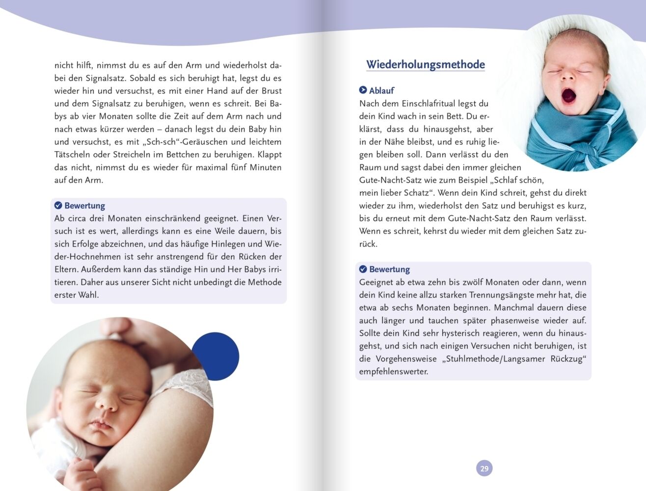 Dies sind nur drei von weiteren möglichen Ursachen, die den Schlaf deines Babys unterbrechen können. In diesem Buch zum Babyschlaf findest du viele praktische Tipps und Anregungen. Es werden unterschiedliche Schlaf- und Einschlafmethoden vorgestellt. Psychologinnen und Pädagoginnen sind sich inzwischen einig darüber, dass jede Methode und Strategie im Umgang mit Kindern nur dann empfehlenswert sind, wenn dabei die Bedürfnisse des Kindes und der gesamten Familie mit einbezogen werden. Deshalb liegt uns bei ElternLeben.de viel daran, dir einen Überblick über weitverbreitete Methoden zu geben und diese als empfehlenswert, nur eingeschränkt empfehlenswert und nicht empfehlenswert zu bewerten.