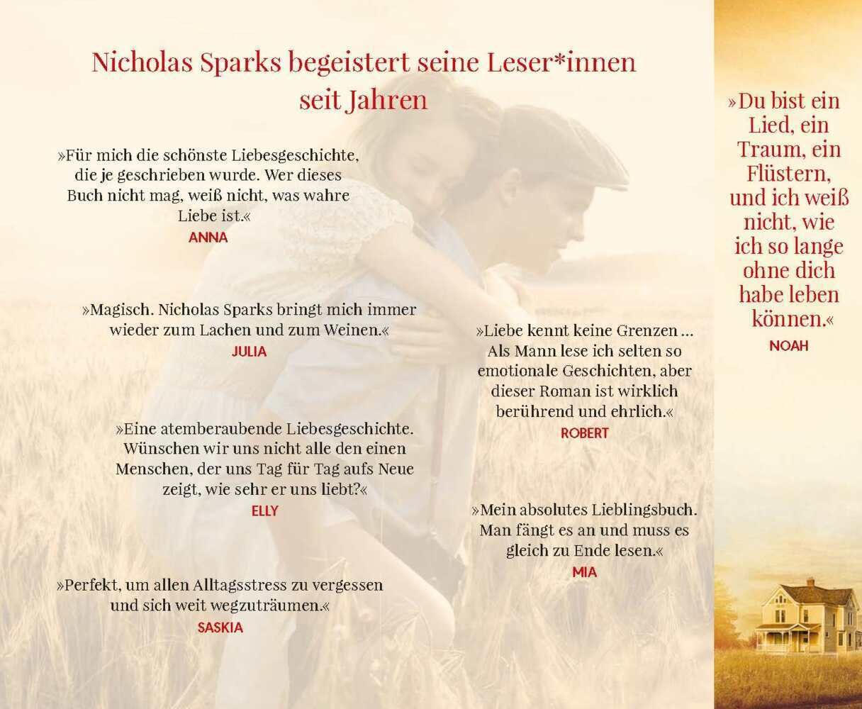 Allie und Noah sind siebzehn und verlieben sich auf den ersten Blick ineinander. Doch nach einem wunderschönen gemeinsamen Sommer muss Allie mit ihrer Familie den verträumten Urlaubsort verlassen. Vierzehn Jahre lang hört Noah nichts mehr von ihr. Dann steht A...