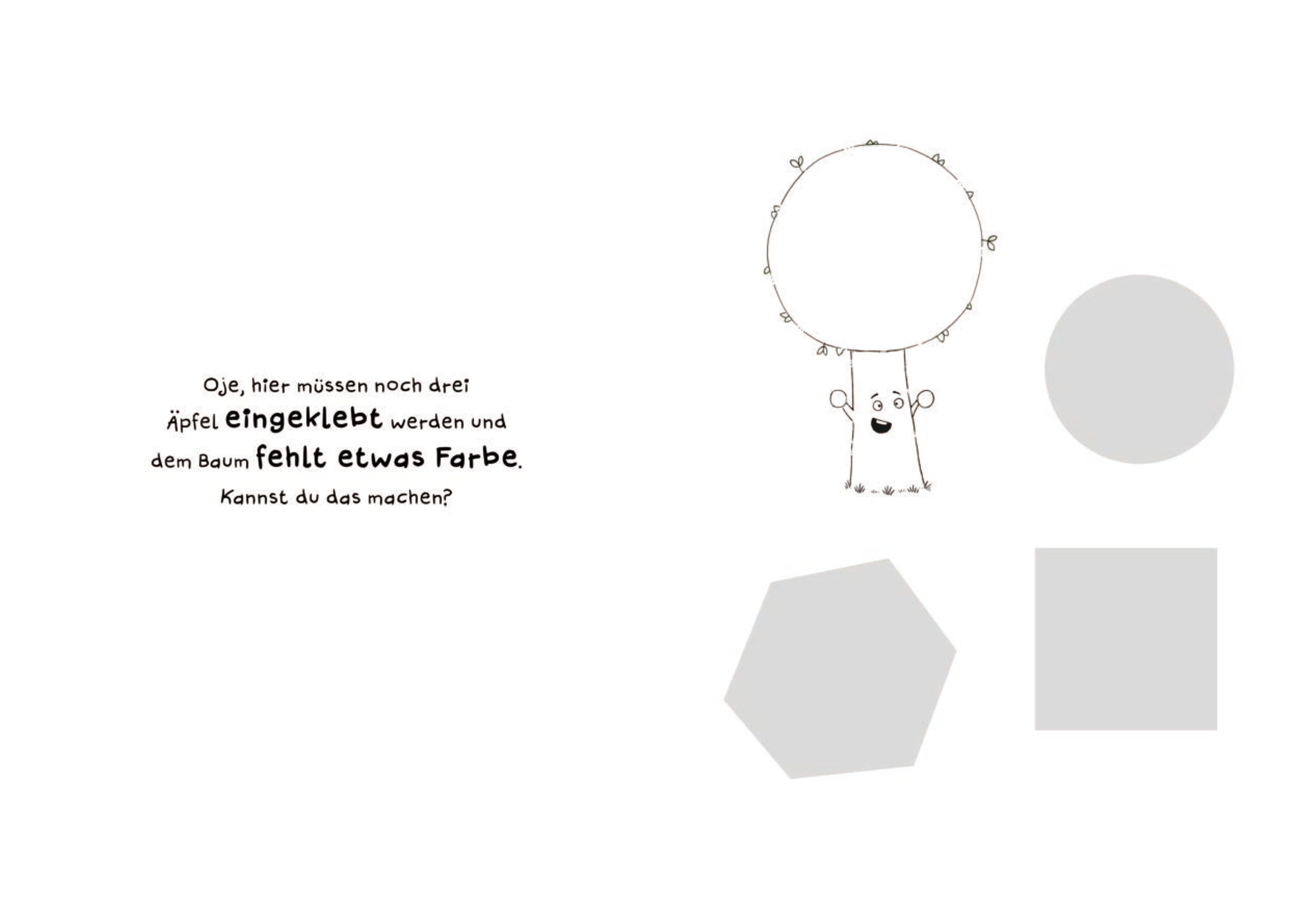 Ausschneiden, aufkleben, ausmalen - das sind die Grundfähigkeiten, die Kinder ab 3 Jahren mit den beliebten Heldinnen und Helden aus "Schüttel den Apfelbaum" üben können. Nico Sternbaum liefert dazu simple Motive wie ein gemaltes Bild von Kalle Kitze...