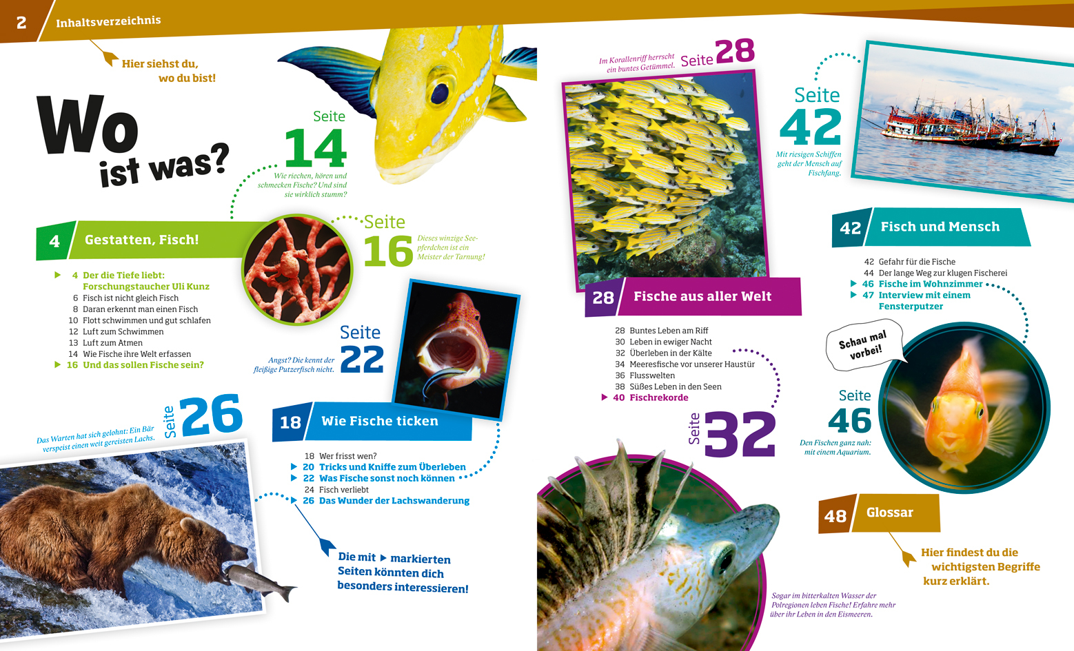 Fische leben überall, wo es Wasser gibt: in den Meeren, Flüssen und Seen, in der Tiefsee und in den Polarmeeren. Die größten werden fast so groß wie ein Schulbus, die kleinsten bleiben kleiner als ein Fingernagel. Manche lauern in Höhlen auf Beute, andere reis...