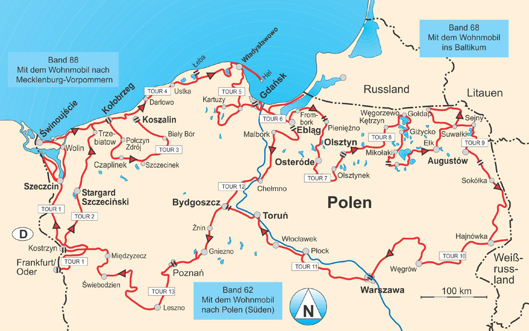 TourenkartenWir führen Sie in 13 abwechslungsreichen Touren über 4000 km durchs nördliche Polen. Entlang der Oder bis zur Ostsee mit weiten Sandstränden, durch Masuren zu glasklaren Seen, durch zahlreiche Nationalparks bis zu den Urwäldern Ostpolens.Natur erle...TourenkartenWir führen Sie in 13 abwechslungsreichen Touren über 4000 km durchs nördliche Polen. Entlang der Oder bis zur Ostsee mit weiten Sandstränden, durch Masuren zu glasklaren Seen, durch zahlreiche Nationalparks bis zu den Urwäldern Ostpolens.Natur erleben, wandernBaden, surfen, wandern, Rad fahren oder paddeln - Polen bietet zahlreiche Möglichkeiten zur Erholung in unberührter Natur. An einsamen Stränden, in den großen Wäldern oder Naturparks, in den größen Wäldern oder Naturparks, in denen Sie mit etwas Glück freilaufende Wisente beobachten können. Kulturschätze, StädteEntdecken Sie ein Land mit viel Geschichte. Wir zeigen Ihnen alte Ritterburgen und sehenswerte Städte wie Warszawa, Gdansk, Torun, Poznan oder Plock mit ihren alten Bauten aus Natur- und Backstein, schöne Kirchen mit goldenene Kuppeln sowie Moscheen.Wasser erleben, badenDer nächste Badeplatz ist niemals weit: Ob an den kilometerlangen Stränden der Ostsee oder an einem der vielen Seen in den Masuren. Zudem bieten Flüsschen wie Krutynia oder Czarna Hancza auch für Anfänger die Möglichkeit zum Wasserwandern in nahezu unberührter Natur. WOMO-ServiceEine große Auswahl an Stell-, Bade- und Picknickplätzen sowie schöne und teilweise naturbelassene Campingplätze mit genauer Beschreibung und präzisen GPS-Daten ermöglichen Ihnen einen angenehmen Urlaub. Zusätzliche Tipps zu Sehenswürdigkeiten, Öffnungszeiten, Verständigung und Landeskunde.