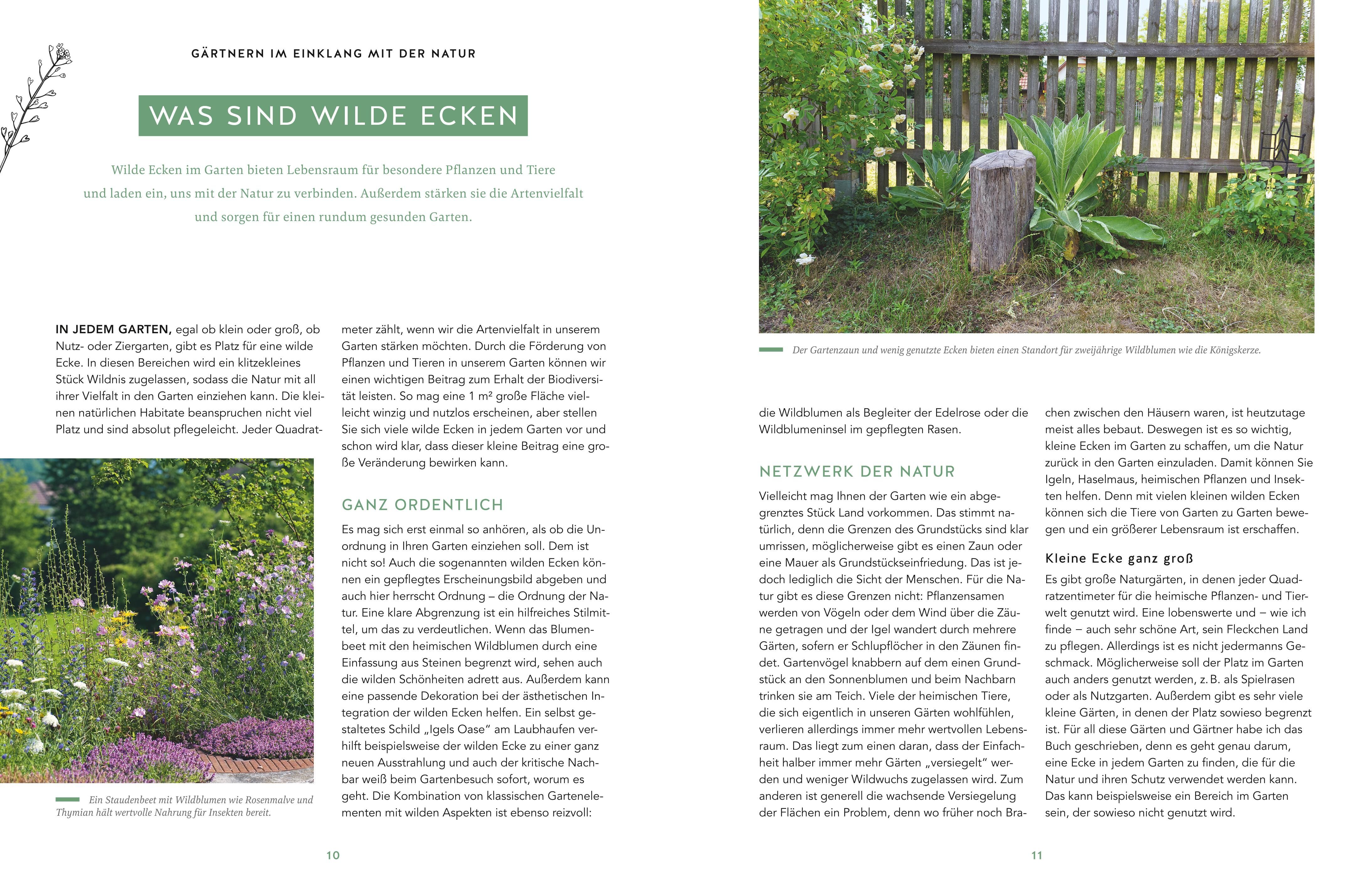 Durch die detailreichen Anleitungen und Pläne ist das Buch auch für Einsteiger geeignet. Außerdem kann jeder selbst entscheiden, wie viel Platz er für die wilden Ecken hergeben und wie viel Aufwand er bei Anlage und Pflege betreiben möchte.