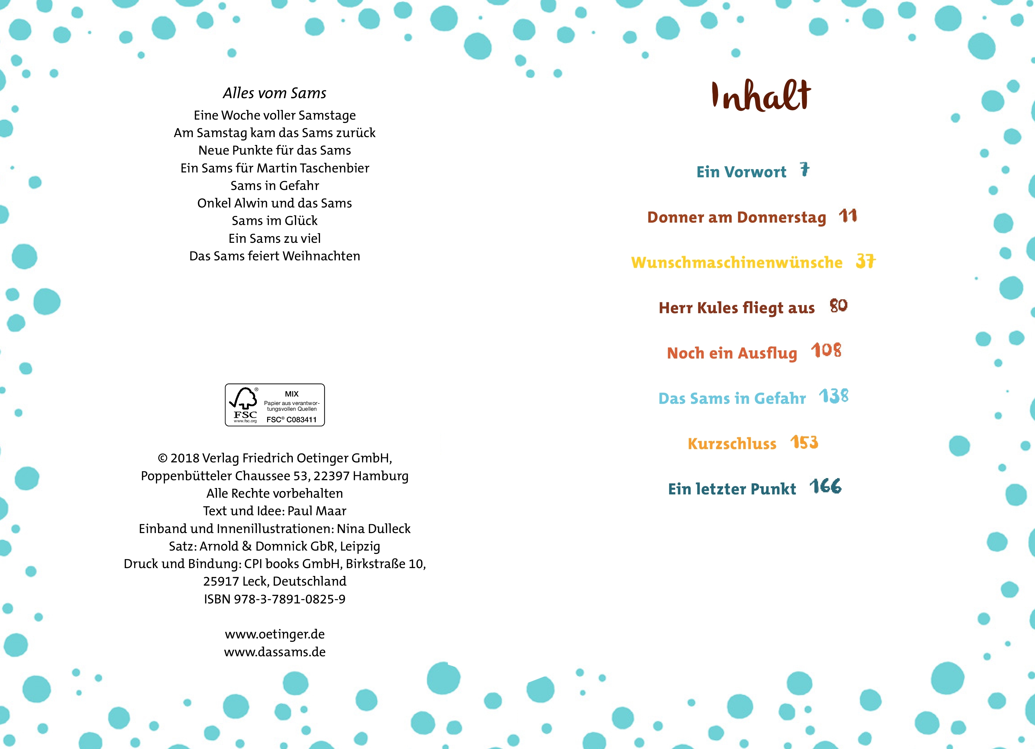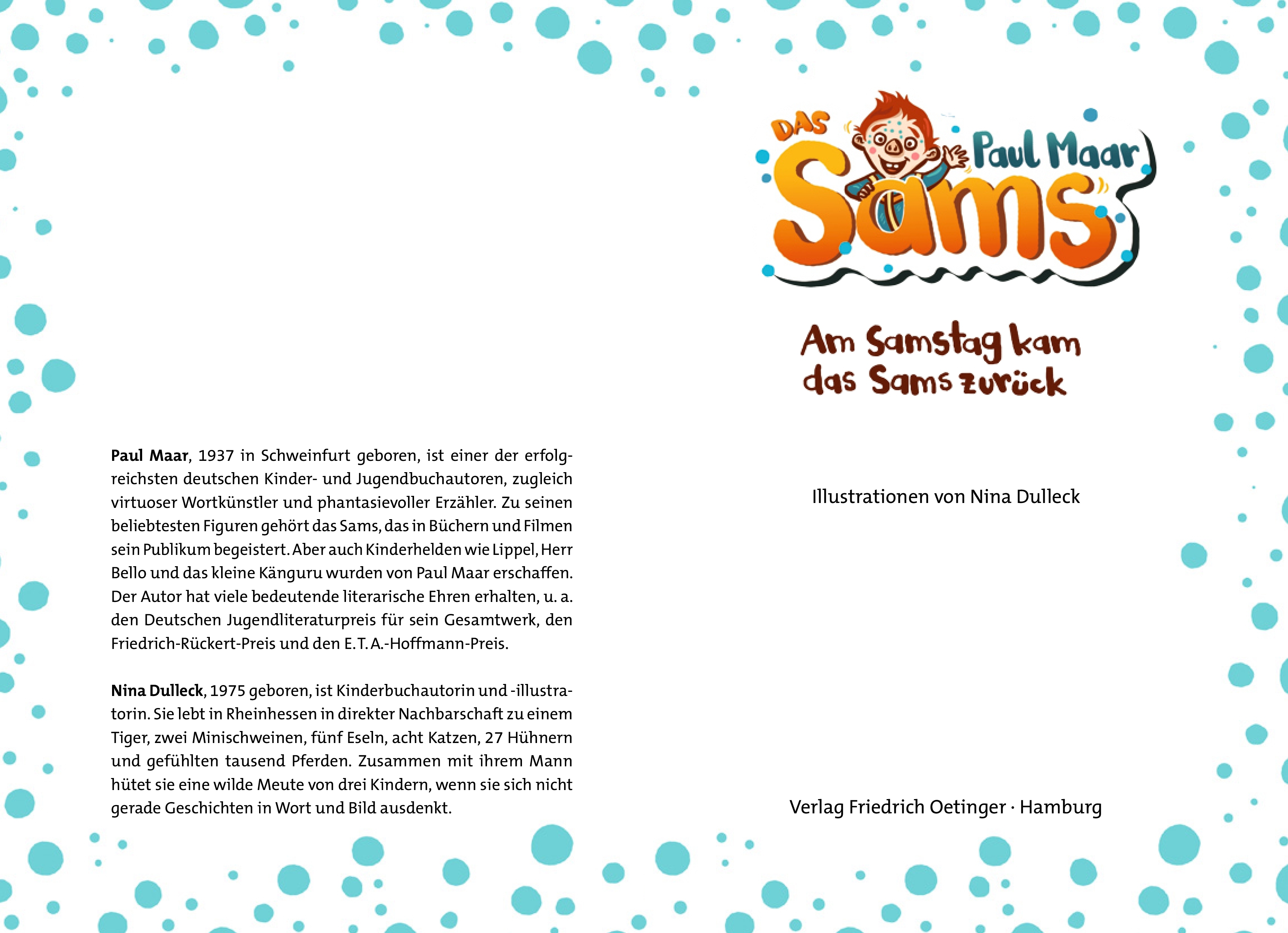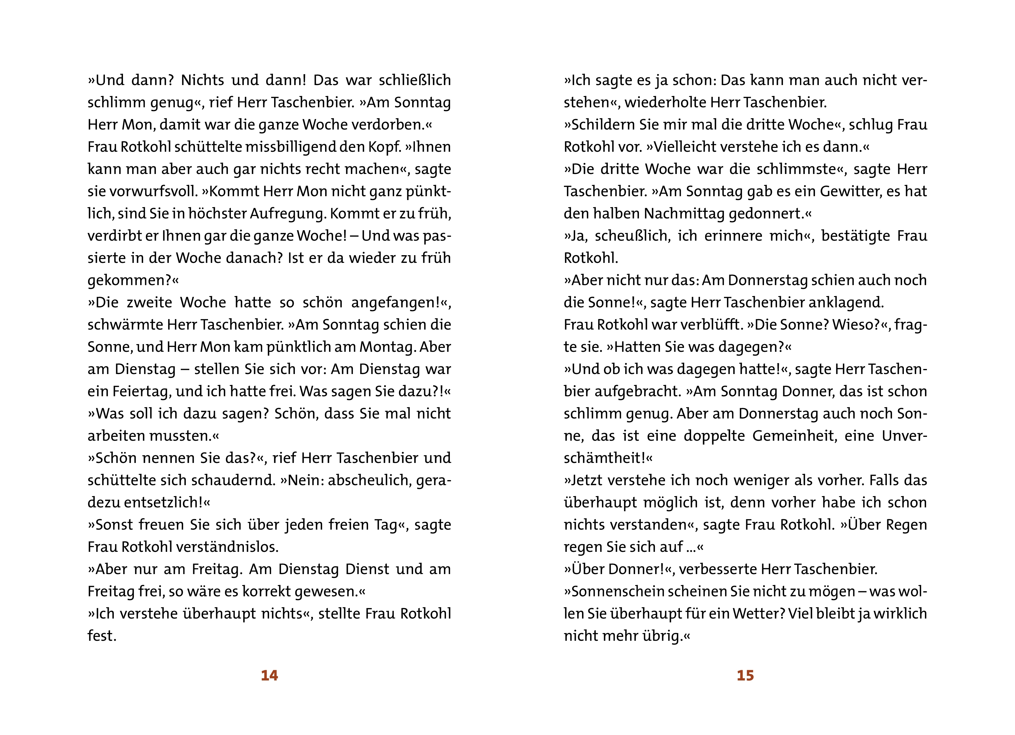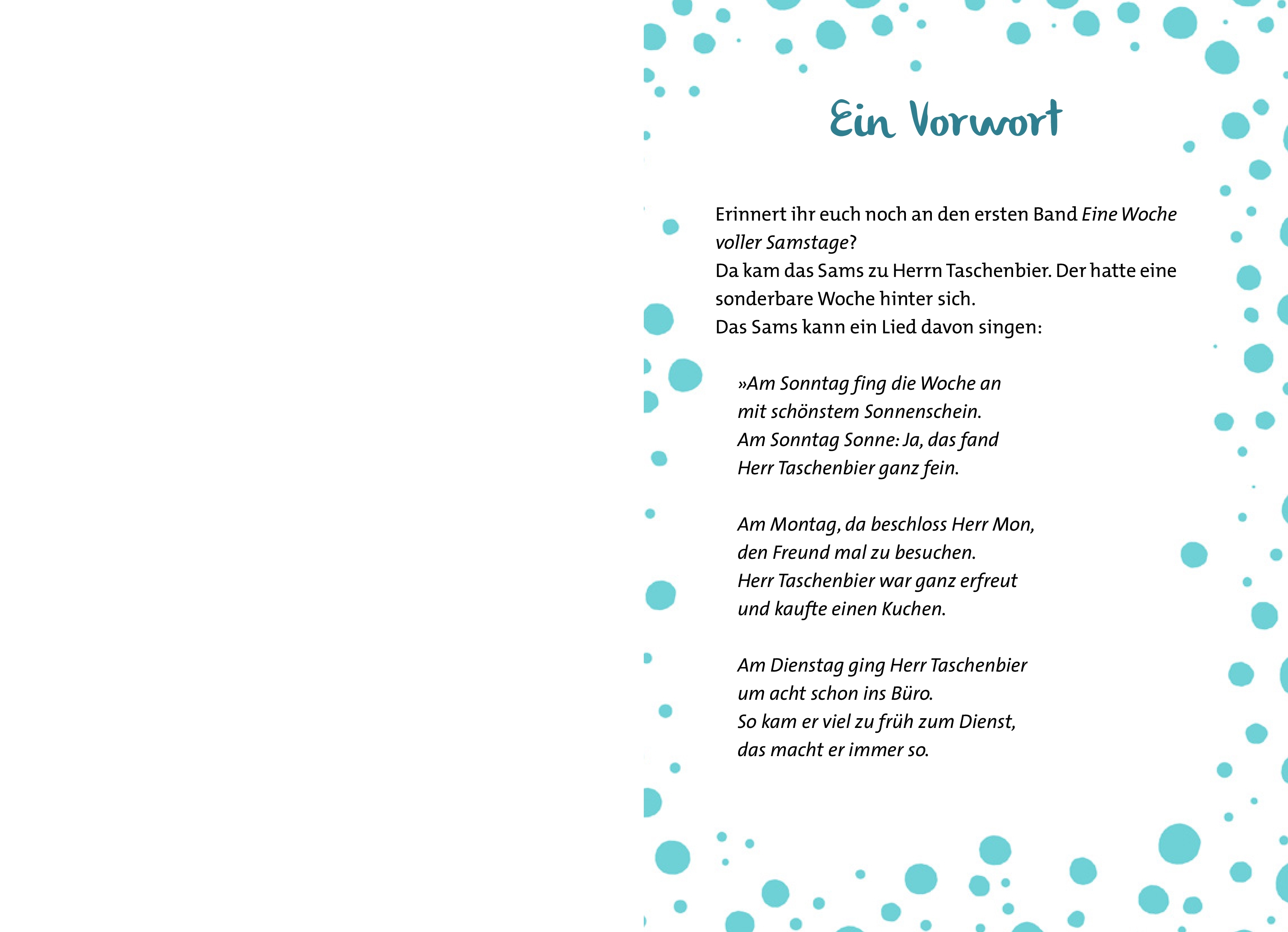 Herr Taschenbier tut alles, damit das Sams zu ihm zurückkommt. Er trifft am Montag Herrn Mon, am Dienstag geht er brav zum Dienst. Am Mittwoch ist zum Glück von ganz alleine Mitte der Woche, und am Donnerstag sorgt Herr Taschenbier höchstpersönlich mit Blech ...
