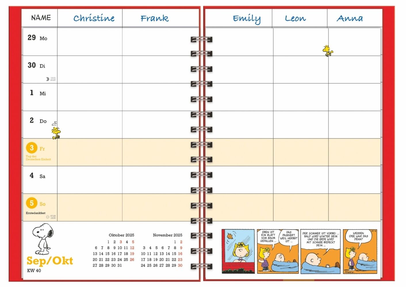 Die ganze Familie im Blick mit den Peanuts. Snoopy, Charlie Brown und Co. helfen mit ihrem unverbesserlichen Humor beim Planen. Familienplaner in Buchform mit viel Platz für Eintragungen. Besonders praktisch: die Namen muss man nur einmal eintragen!