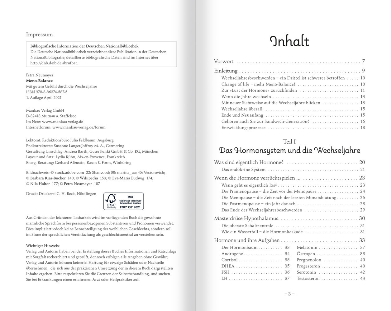 ((Auszug aus Teil I: Das Hormonsystem und die Wechseljahre))GELIEBTE "HORMONFREUNDE"Bereits kleinste Störungen können unser Hormonsystem aus seiner natürlichen Balance werfen und verschiedenste Beschwerden in Psyche und Körper auslösen. Vieles haben wir selbst in der Hand, denn wir können "Hormonfeinde" einfach meiden und mehr "Hormonfreunde" zu uns einladen. Nur wer Freund und Feind kennt, kann sich proaktiv mit seinen Gedanken auf einen gesunden Lebensstil und auf Meno-Balance ausrichten. Erfahren Sie hier, welche Hormonfreunde Ihnen ganz besonders guttun.Ruhe und EntspannungUm einen ständig zu hohen Cortisolspiegel zu senken, sind Ruhe und Entspannung die zwei Zauberwörter. Helfen können Entspannungstechniken wie autogenes Training, progressive Muskelrelaxation oder Yoga. Aber auch Waldspaziergänge, Lieblingsmusik oder eine Tasse Tee auf der Couch tun gut und senken den Stresspegel.Hormonyoga ist speziell darauf ausgerichtet, die Hormondrüsen zu aktivieren, damit Hormone in ausreichenden Mengen produziert werden. Mithilfe von Atmung, Stellungen (Asanas) und Energielenkung werden die Hormondrüsen sanft angeregt. Hormonyoga ist nicht nur bei Wechseljahresbeschwerden ideal, sondern auch bei PMS, unerfülltem Kinderwunsch, verfrühter Menopause und allen weiteren Dysbalancen des Hormonsystems. Am besten lernt man es in einem Kurs und kann die Übungen dann zu Hause in seinen Tagesablauf integrieren. Auf Seite 175 ff. stellen wir Ihnen drei hilfreiche Hormonyoga-Übungen vor. (...)Hilfreiche HeilpflanzenDie Natur bietet eine Fülle an Heilpflanzen und Wildkräutern, die bei Östrogen- oder Progesteronmangel helfen, die körpereigene Hormonproduktion anzukurbeln, oder harmonisierend wirken. Östrogenfördernd sind: Hopfen, Traubensilberkerze, Sibirischer Rhabarber, Rotklee, Moringa. Progesteronfördernd sind: Yamswurzel, Frauenmantel, Maca, Passionsblume oder Mönchspfeffer. Allgemein harmonisierend sind: Johanniskraut, Salbei und Nachtkerze. Lesen Sie mehr dazu ab Seite 100.Hormongesunde ErnährungDie Jahre wechseln - und Ihre Ernährungsweise sollte das auch tun! In gewisser Weise sind die meisten von uns Gewohnheitstiere, haben die gleichen Vorlieben und essen immer wieder die gleichen Lieblingsgerichte. Eingefahrene und liebgewonnene Ess- oder Verhaltensmuster aufzugeben ist wirklich schwer! Aber es lohnt sich, insbesondere, wenn Sie auf die Wechseljahre zusteuern. Denn Meno-Balance - das bedeutet auch eine gute Immunabwehrlage und zugleich optimale Prävention gegen ein erhöhtes Brustkrebsrisiko.Durch eine gesunde Lebens- und Ernährungsweise sorgen Sie für hormonelle Balance und wirken zugleich einer Östrogendominanz entgegen. Zu einer optimalen Ernährungsweise zählen natürlich ausreichend Vitalstoffe.Ab heute: real food!Mit "real food" wird alles bezeichnet, was frisch, unverarbeitet und ohne Plastikverpackung erhältlich ist: Obst und Gemüse, Hülsenfrüchte, Nüsse, Samen und Kräuter. Kaufen Sie regional und möglichst Bioware, niemand möchte Glyphosat im Blut haben.No-Gos!Verzichten sollten Sie möglichst auf Milchprodukte, "schlechte" Kohlenhydrate wie Zucker und Mehl und auf ein Zuviel an Soja, Gluten, Alkohol und Fleisch. Das klingt hart, aber es macht Sinn. Studien verdeutlichten, dass beispielsweise Casein, das Milchprotein, aktiv an der Krebsentstehung beteiligt ist. Der Autor und Arzt Ruediger Dahlke fasste sein Wissen für eine optimale Ernährungsweise unter dem Namen "Peacefood" zusammen. Vor dem Hintergrund der neuesten neuroendokrinologischen Erkenntnisse erklärt er in seinen Büchern über "Peacefood", was wir essen müssen, um Hormone wie Serotonin, Dopamin oder Gaba zu befeuern und dadurch unsere körperliche und seelische Balance zu finden. (...)