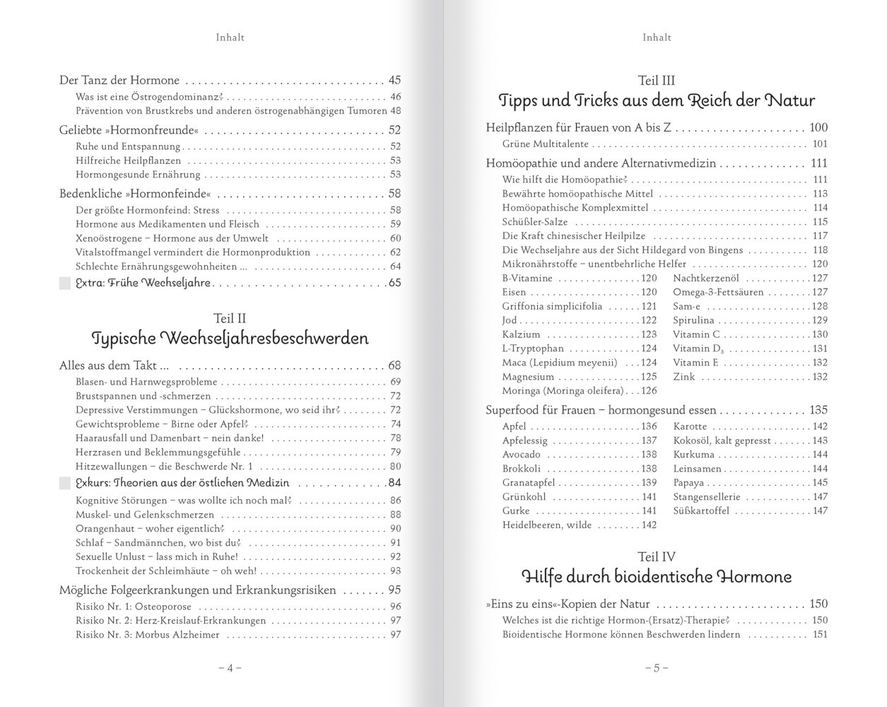 INHALT Vorwort Einleitung - Wechseljahresbeschwerden - ein Drittel ist schwerer betroffen - Change of life - mehr Meno-Balance! - Zur "Lust der Hormone" zurückfinden - Wenn die Jahre wechseln - Mit neuer Sichtweise auf die Wechseljahre blicken - Wechseljahre überall - Ende und Neuanfang - Gehören auch Sie zur Sandwich-Generation? - Entwicklungsprozesse TEIL I: DAS HORMONSYSTEM UND DIE WECHSELJAHRE Was sind eigentlich Hormone? - Das endokrine System Wenn die Hormone verrücktspielen - Wann geht es eigentlich los? - Die Prämenopause - die Zeit vor der Menopause - Die Menopause - die Zeit nach der letzten Monatsblutung - Die Postmenopause - ein Jahr danach - Das Ende der Wechseljahresbeschwerden Masterdrüse Hypothalamus - Die oberste Schaltzentrale - Wie ein Wasserfall - die Hormonkaskade Hormone und ihre Aufgaben - Der Hormonbaum Der Tanz der Hormone - Was ist eine Östrogendominanz? - Prävention von Brustkrebs und anderen östrogenabhängigen Tumoren Geliebte "Hormonfreunde" - Ruhe und Entspannung - Hilfreiche Heilpflanzen - Hormongesunde Ernährung Bedenk…