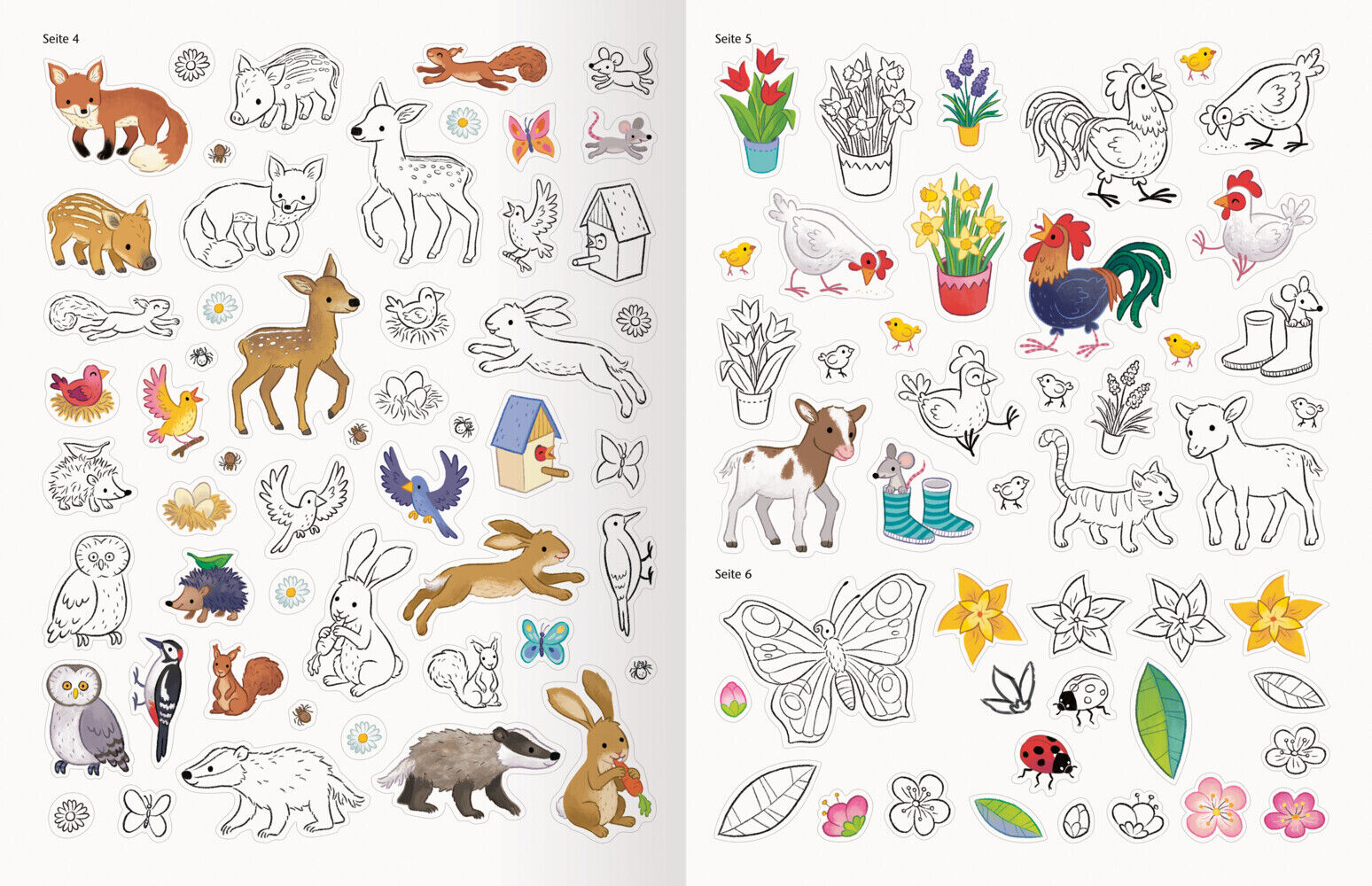 Hier werden Malen und Stickern aufs Schönste vereint - mit ausmalbaren Stickern! Von einer bunt blühenden Frühlingswiese über ein Picknick auf einer saftig grünen Wiese bis hin zu einer lustigen Eiersuche mit süßen Hasen und bunten Eiern finden Kinder in diese...