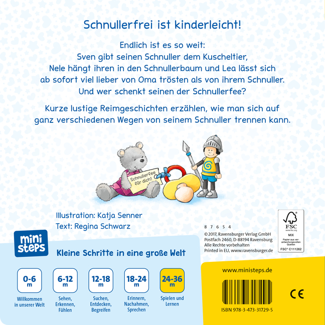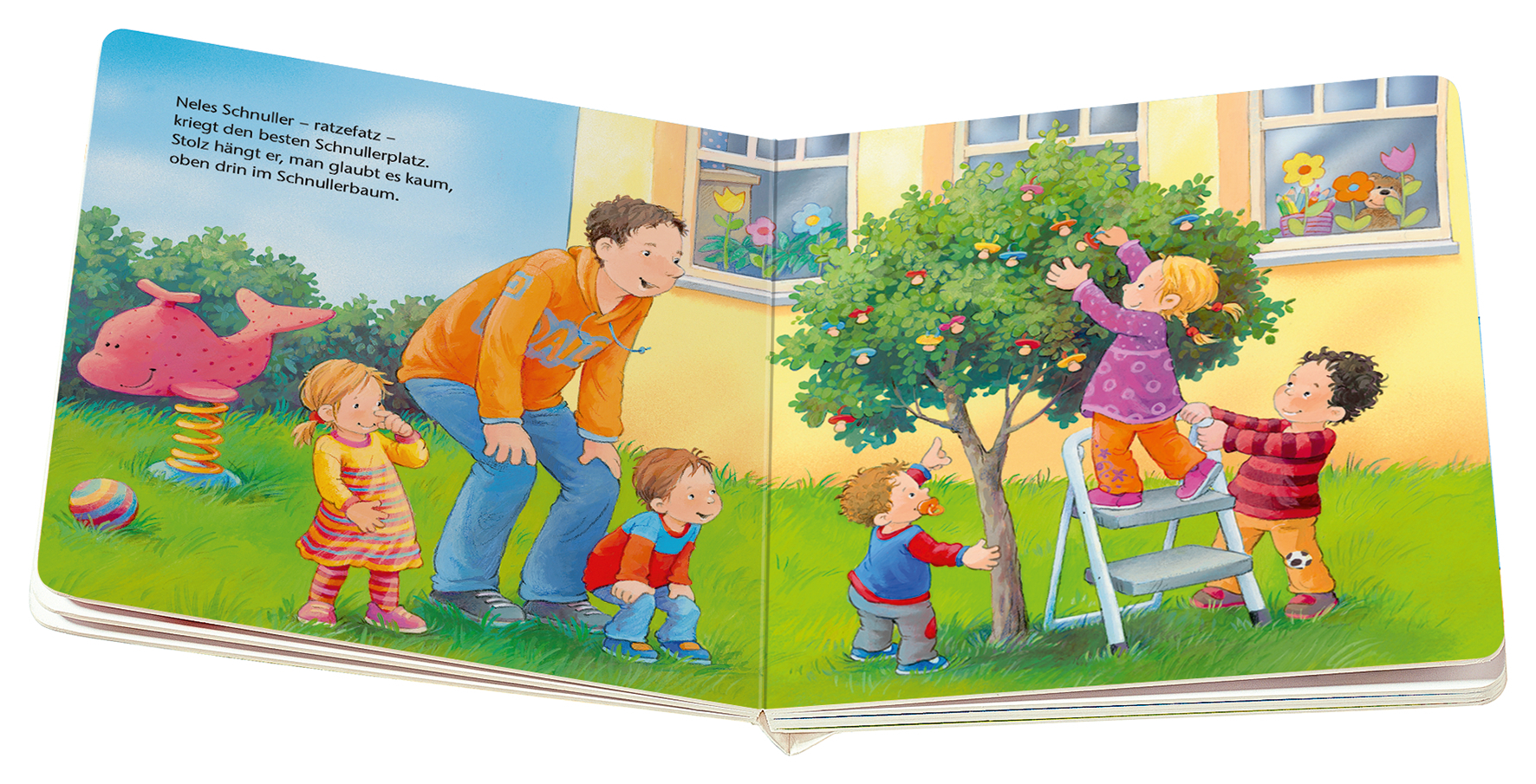 In diesem Pappbilderbuch erzählen kurze Reime von ganz unterschiedlichen Ritualen, um sich von seinem Schnuller zu verabschieden: Sven gibt seinen Schnuller dem Kuscheltier, Nele hängt ihre Schnuller in den Schnullerbaum, Jakob lässt seinen Schnuller von einem...