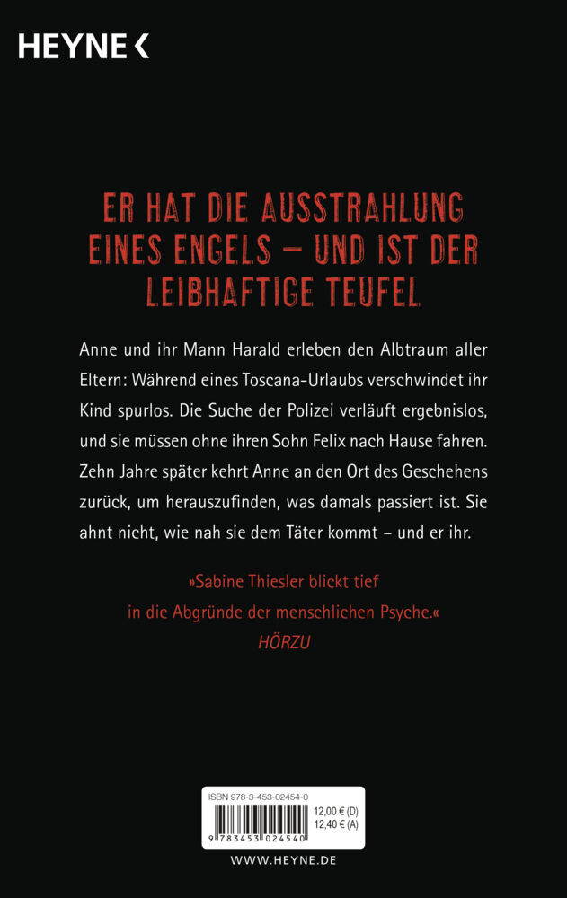 Anne und ihr Mann Harald erleben den Albtraum aller Eltern: Während eines Toscana-Urlaubs verschwindet ihr Kind beim Spielen spurlos. Die Suche der Polizei verläuft ergebnislos, und sie müssen ohne ihren Sohn nach Hause fahren. Zehn Jahre später kehrt Anne an den Ort des Geschehens zurück, um herauszufinden, was damals passiert ist. Sie ahnt nicht, wie nah sie dem Täter kommt - und er ihr.Ein Roman, der einem zuweilen den Hals abschnürt, so schrecklich realistisch ist die Geschichte.