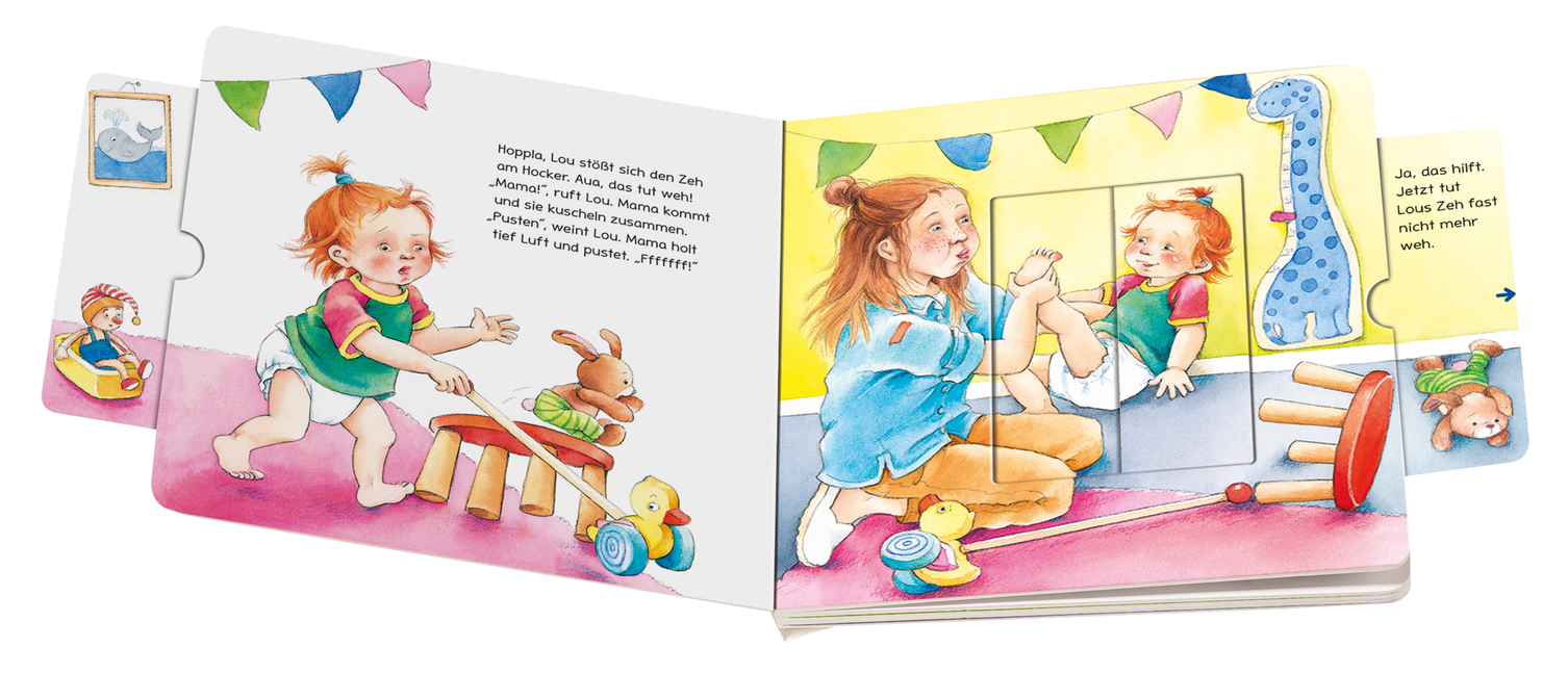 Liebevolle Szenen zum Thema Trost für die Kleinen Lou hat sich den Zeh gestoßen, Hannah tut der Bauch weh und Mika vermisst seinen Papa. Trösten und getröstet werden ist sowohl für Kinder als auch für Eltern ein wichtiges Thema. Stabile Schiebeffekte verändern...
