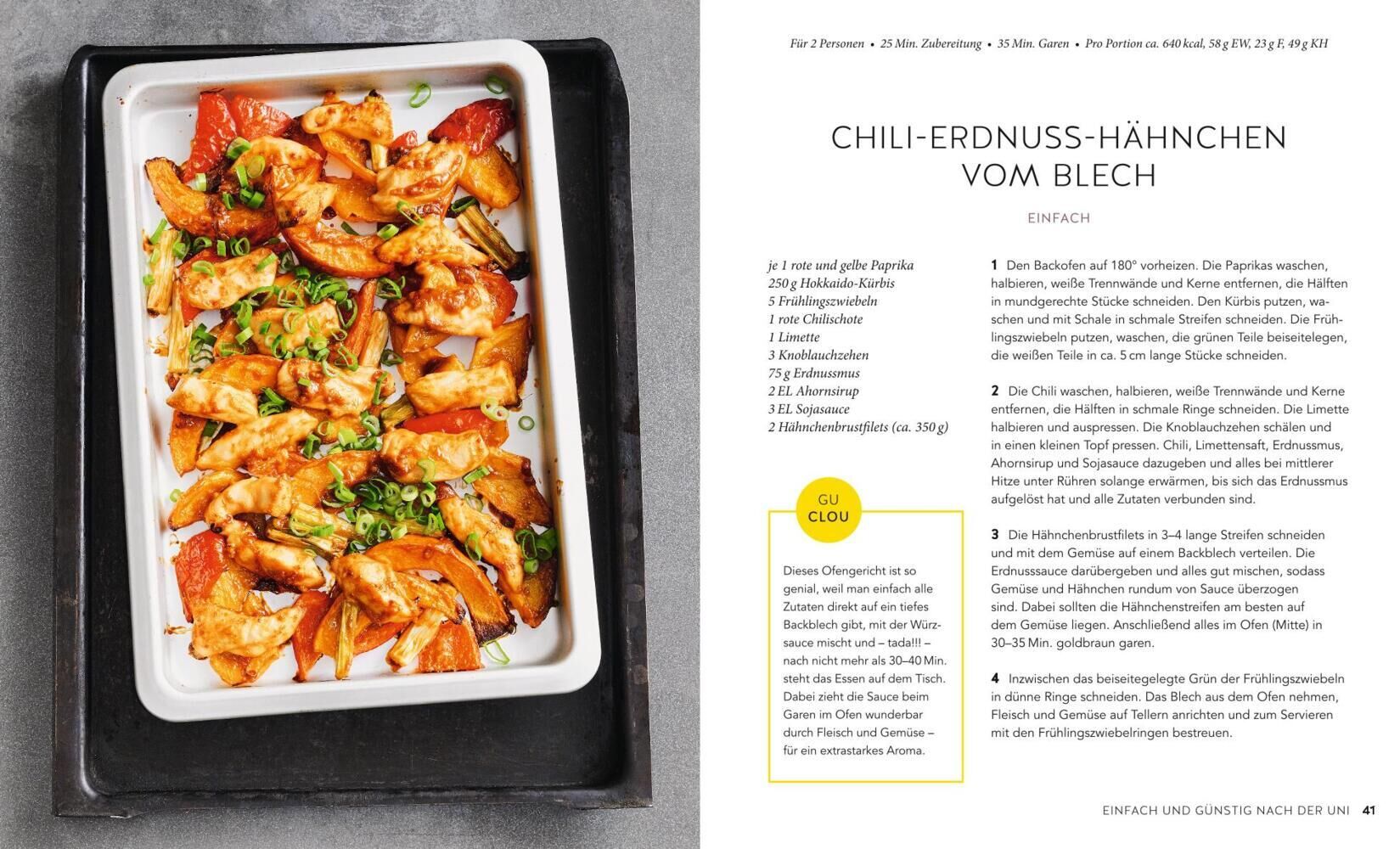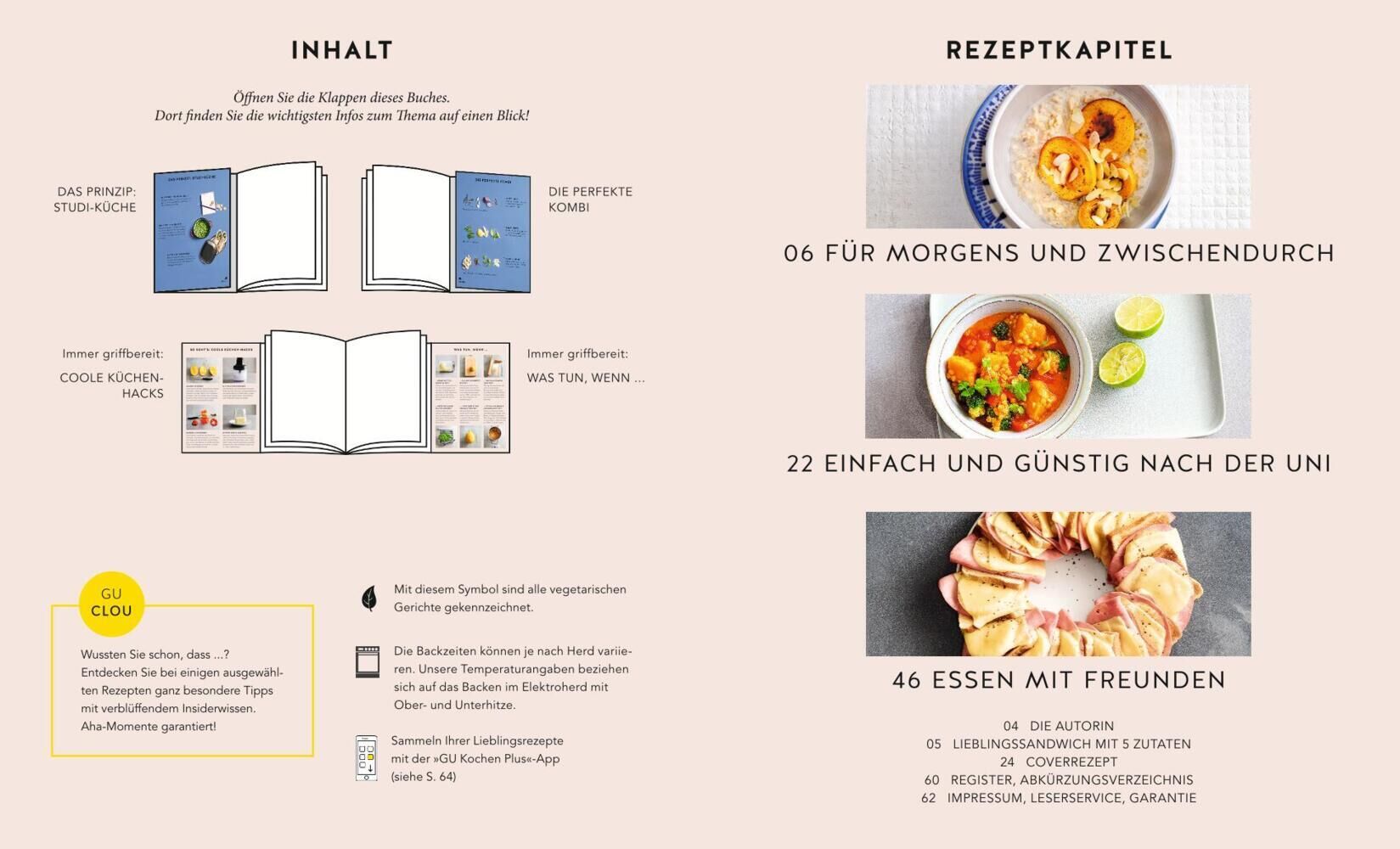 Die Uni beginnt, die Studenten-WG winkt: Hallo, sturmfreie Bude und lange Abende mit Kumpels und Freunden! Flügge werden fühlt sich cool an. Doch wenn s ans Kochen geht, fehlt halt doch was: Das gute Essen von daheim, das Rundum-happy-Paket aus Mamas Küche. Wie gut, dass Mutti vorgesorgt und das Studentenkochbuch von GU gleich mit in die Umzugskisten gepackt hat: Damit können selbst absolute Anfänger sich den ganzen Uni-Tag über, vom Frühstück bis zur WG-Party, gesund und easy selbst verköstigen, super lecker, super simpel: Banana Bread, Superfood-Muffins oder selbstgemachte Schoko-Creme sind Brainbooster für die Vorlesung. Kohlauflauf mit Würstchen, Chili-Erdnuss-Hähnchen, gepimptes Kartoffelpüree oder Linsen-Bolognese sind Kindheits-Memories pur. Toastbrot-Ring-Hawaii, Nudelsalat mit Brokkoli oder Schokokuchen sorgen an Feier-Abenden für allerbeste Laune. Dazu jede Menge Tipps und Tricks rund ums Einkaufen, Vorsorgen und Meal Prep für den Pausensnack. Das lernt man nicht auf der Uni!