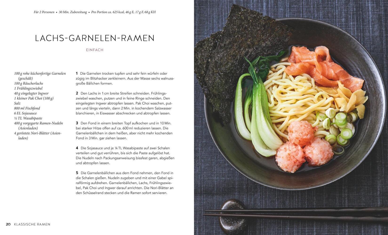 Klassische Ramen bestehen oft aus Fleischbrühe und haben Schweinebauch, Hühnchen oder Hackfleisch als Einlage . Genau dafür liefert das Buch im ersten Kapitel Klassische Ramen eine Menge Kombinationsideen. Kochen Sie zum Einstieg doch einfach: