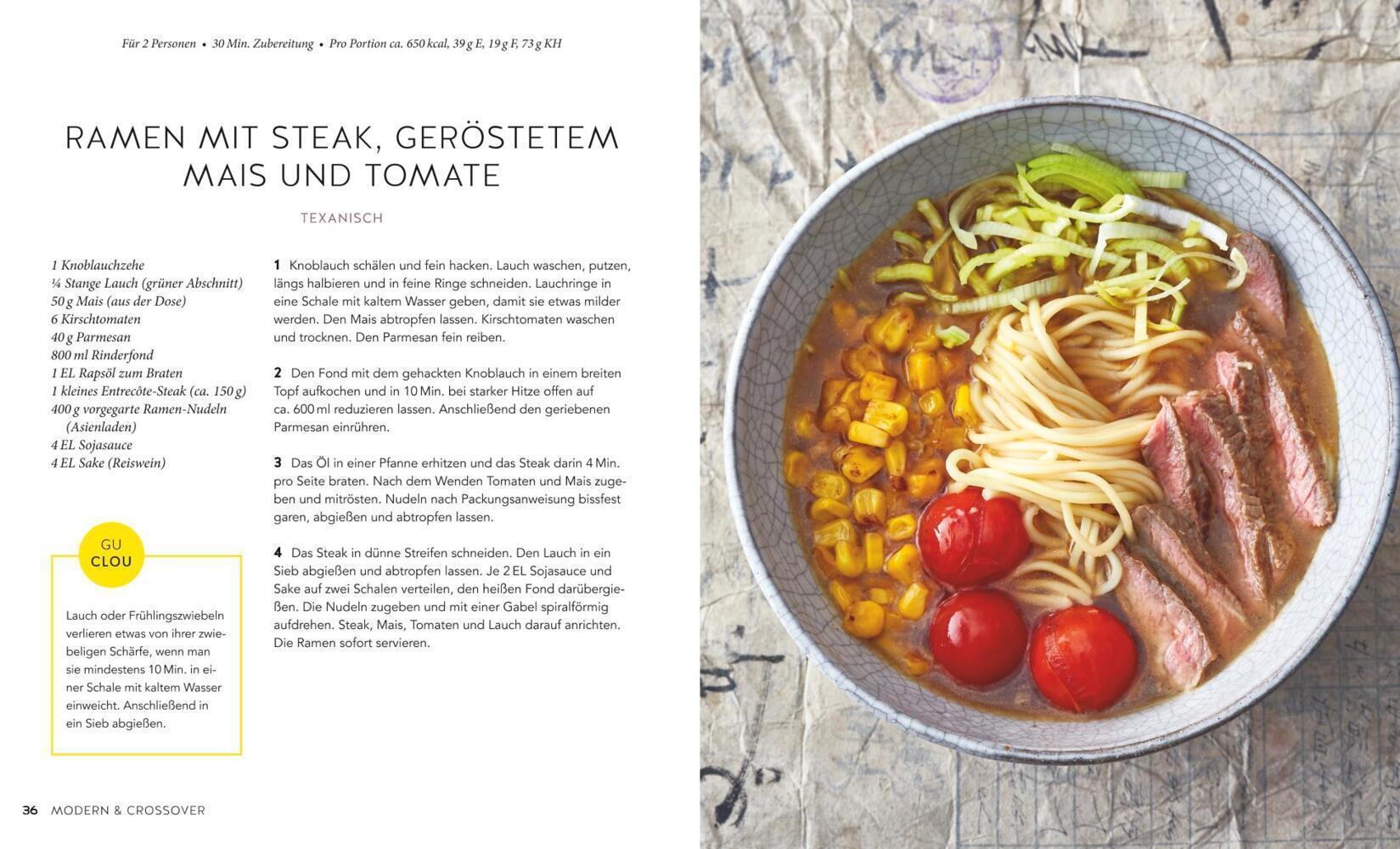 Hier zeigen die beiden Autoren ihr ganzes Können, indem sie die klassischen Ramen international weiterspinnen . Es geht nach Italien, Kalifornien, Bayern und Mexiko und neben Fleisch- und Fischrezepten gibt es auch vegetarische und vegane Kreationen im zweiten Kapitel. Probieren Sie unbedingt: