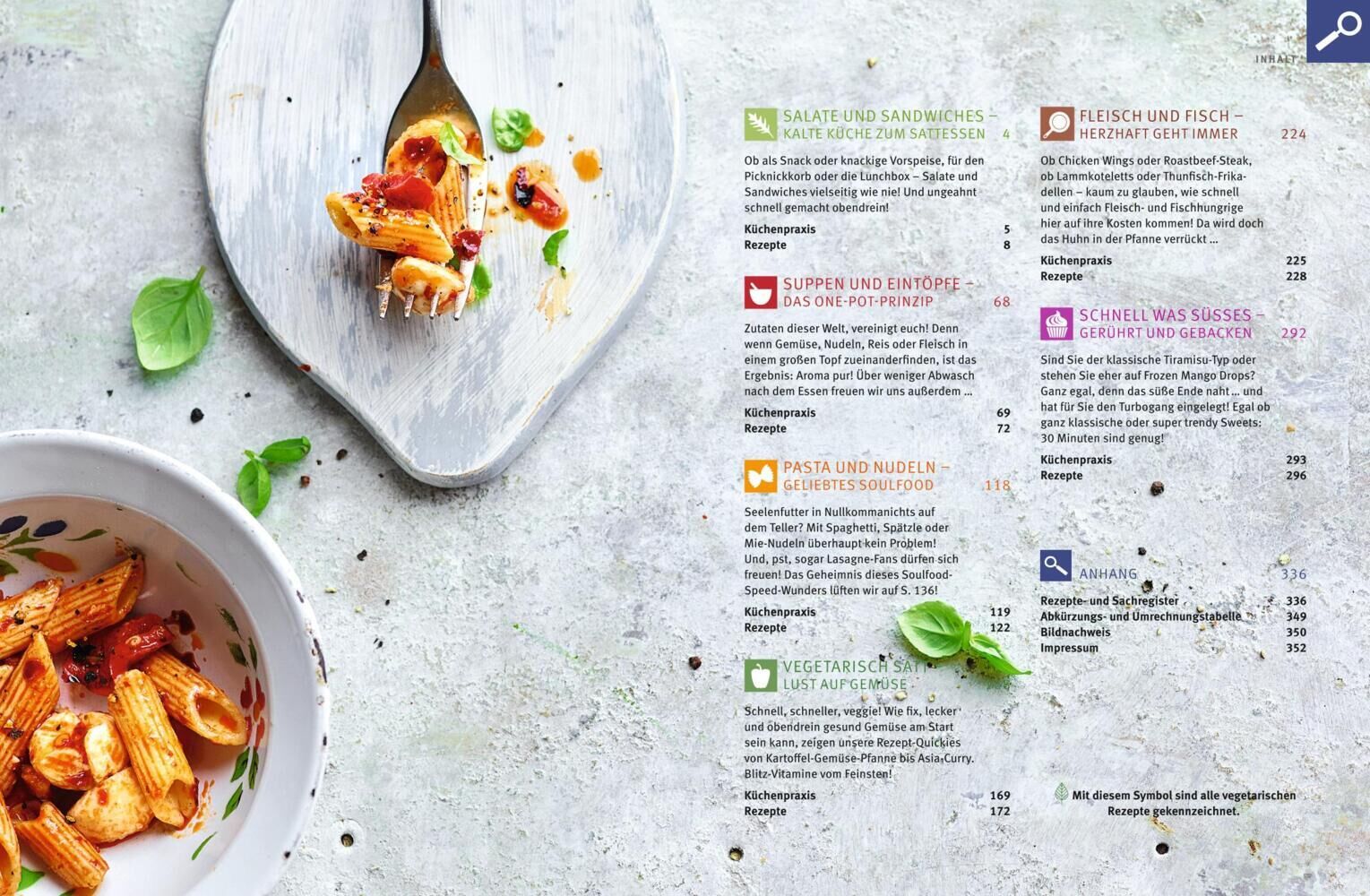 In dem neuen Klassiker findet man nicht nur Grundrezepte und Hauptgerichte, auch kleine Speisen, Vorspeisen und Desserts sind enthalten. Alle raffiniert konzipiert und fotografiert, stets mit dem Augenmerk auf Zeitersparnis. Dabei darf man sich über folgende Kategorien freuen: