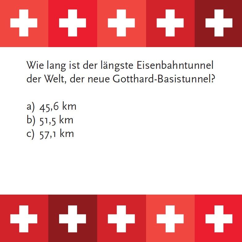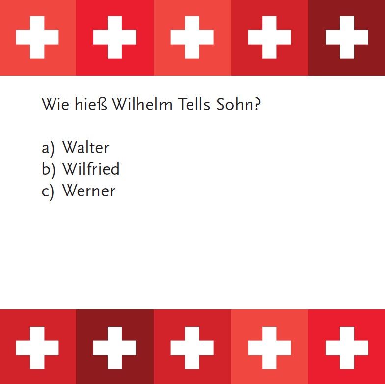 Ab 2 Spielern. Spieldauer: variabel Klappentext "Freude herrscht." Sowohl bei Bundesrat Adolf Ogi (jedenfalls in dem Moment, in dem er es sagte) als auch, wenn Sie das Schweiz-Quiz auspacken. 66 Fragen , 198 mögliche Antworten und niemand muss unparteiisch ble...