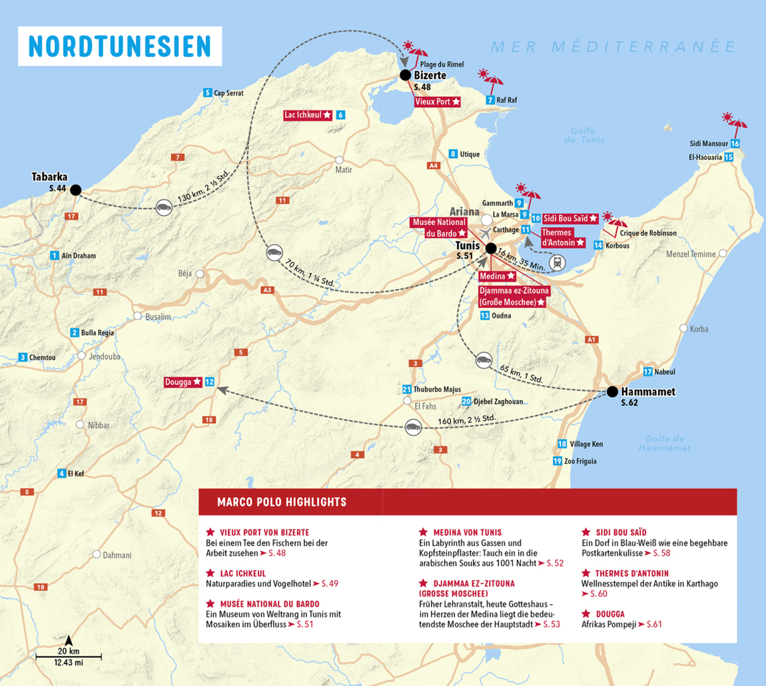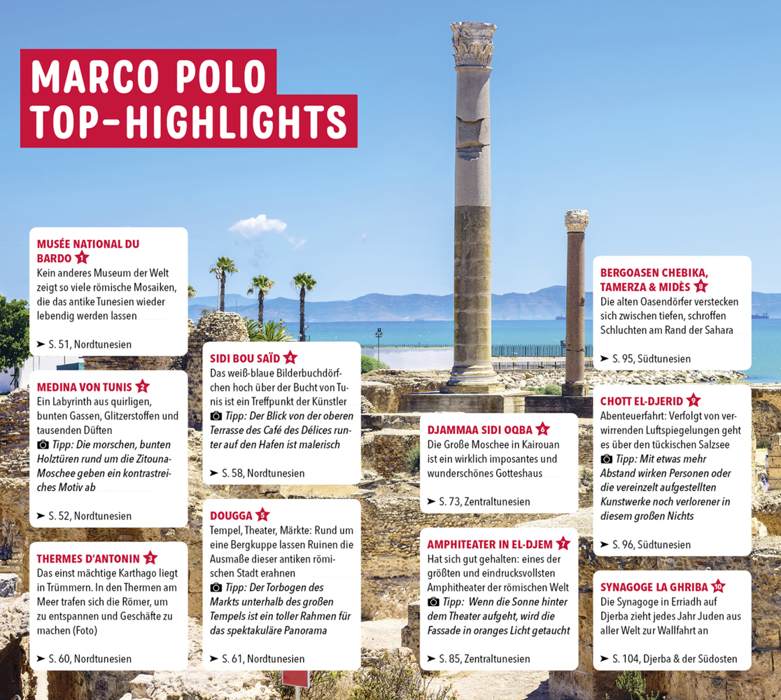 Vom Wald in die Wüste und ans Meer: Mit dem MARCO POLO Reiseführer Tunesien erkunden Du wolltest schon immer mal auf einem Kamelrücken durch die Sahara schaukeln? Unterm Sternenhimmel den Strand zum Dance Floor machen? In Hamams und Shisha-Bars entspannen? Da...