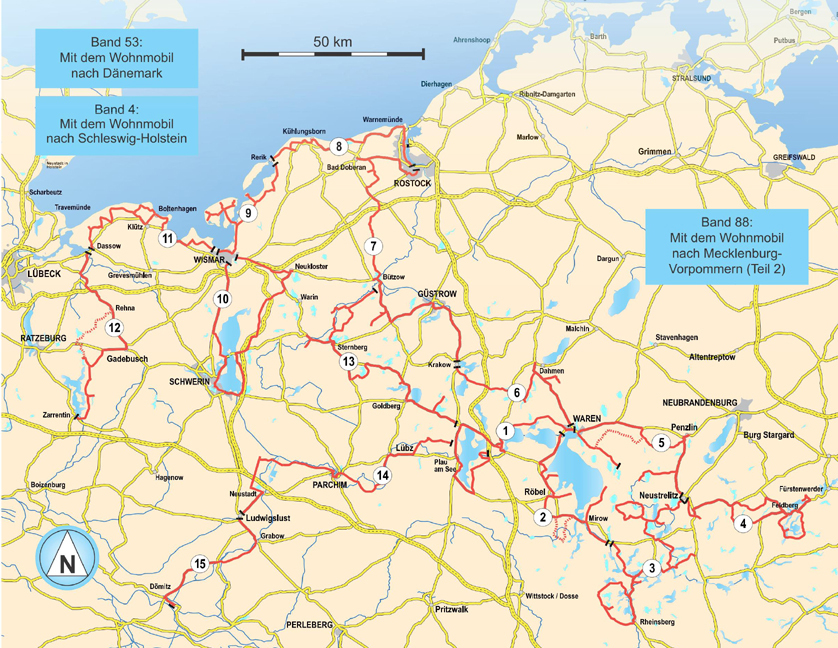 TourenkartenUnsere Rundfahrt durch Mecklenburg ist in 15 Touren unterteilt, die Sie nach Wunsch kombinieren können. Zu jeder Tour zeigt eine Übersichtskarte die Fahrstrecke, die Positionen von Stellplätzen, Campingplätzen, Badestränden und Sehenswürdigkeiten.N...TourenkartenUnsere Rundfahrt durch Mecklenburg ist in 15 Touren unterteilt, die Sie nach Wunsch kombinieren können. Zu jeder Tour zeigt eine Übersichtskarte die Fahrstrecke, die Positionen von Stellplätzen, Campingplätzen, Badestränden und Sehenswürdigkeiten.Natur erleben, wandernDurchquert man die Mecklenburgische Seenplatte auf der Straße, wird man nur wenige der tausend Seen entdecken. Wirklich nahe kommt man der wilden Natur und der ungewöhnlich reichen Tierwelt rund um die Müritz nur zu Fuß, mit dem Fahrrad oder dem Boot.Kulturschätze, StädteWismar, Schwerin und Neustrelitz sind nur drei der schönen Städte Mecklenburgs mit gut erhaltener Bausubstanz und beeindruckenden Kirchenbauten im Stil der Backsteingotik. Im ländlichen Raum sorgen Gutshäuser und Schlösser für architektonische Highlights.Wasser erleben, badenEin Badeplatz ist in Mecklenburg niemals weit - egal ob an einem der vielen Seen im Landesinneren oder an der Ostseeküste. Besonders schöne Badeziele sind die kleine Insel Poel oder der lange Strand von Rerik. Wer es lebhaft mag, besucht die Badeorte Boltenhagen und Kühlungsborn.WOMO-ServiceMit GPS-Daten und Anfahrtsbeschreibung sind unsere Stellplätze leicht zu finden. Die Stellplatzkästen enthalten eine Kurzbeschreibung, Infos über V/E, Wasserversorgung, Ausstattung und Preise.