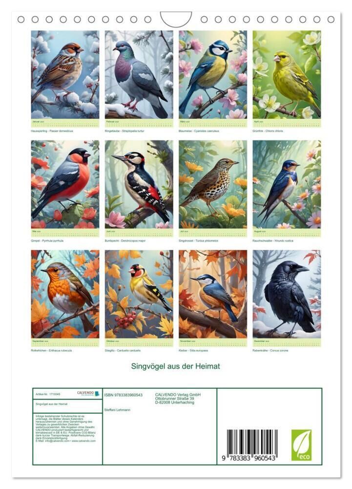 Die wundervolle Welt der Singvögel in ihrer natürlichen Umgebung zeigt dieser Kalender. Jedes Bild, das Steffani Lehmann mit Unterstützung einer KI editiert hat, besticht durch seine naturnahe Detailtreue. Als Mehrwert sind auch die Lateinischen Namen der einz...