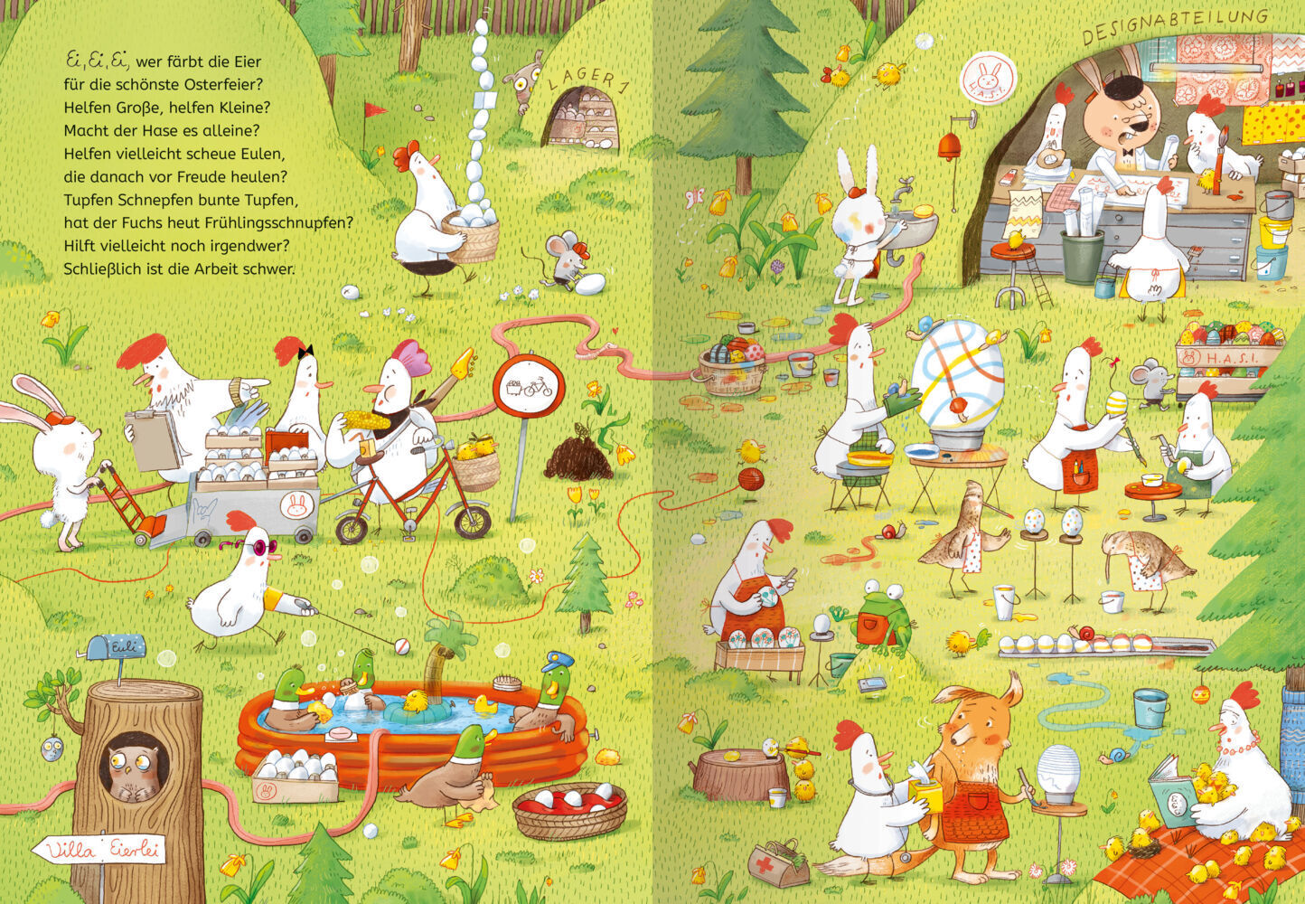 Bald kommt der Osterhase! Während die Kinder sehnsüchtig auf den Osterhasen warten und sich auf das Eiersuchen am Ostersonntag freuen, haben der Osterhase und seine Helfer eine ganze Menge zu tun: Schließlich müssen die Eier erst einmal gelegt und bemalt werde...