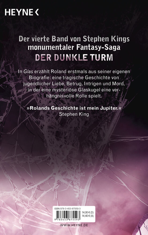 Nach "Schwarz", "Drei" und "tot" legt Stephen King mit "Glas" nun den vierten Teil seines Zyklus' vor, der nahtlos an "tot" anschließt. Roland und seine Freunde befinden sich an Bord des Zuges Blaine, wo s...