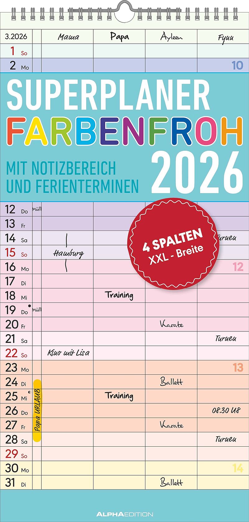 Superplaner Farbenfroh 2026 mit 4 Spalten - Ihr zuverlässiger Familienorganisator Mit dem Superplaner Farbenfroh behalten Sie das Chaos des Alltags im Griff und organisieren die Termine Ihrer Familie stilvoll und effektiv. Ob gemeinsamer Shopping-Tag, Spielea...