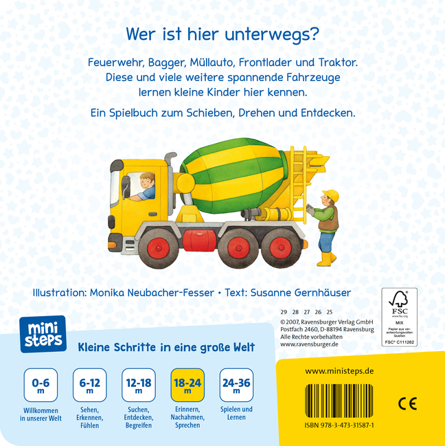 Kleinkinder lieben Fahrzeuge, egal ob Feuerwehrauto, Bagger oder Müllabfuhr! In diesem Spielbuch können Kinder ab 18 Monaten auf jeder Seite mithelfen und selbst aktiv werden. Große Drehscheiben, spannende Klappen und stabile Schieber binden die Kleinen ins Ge...