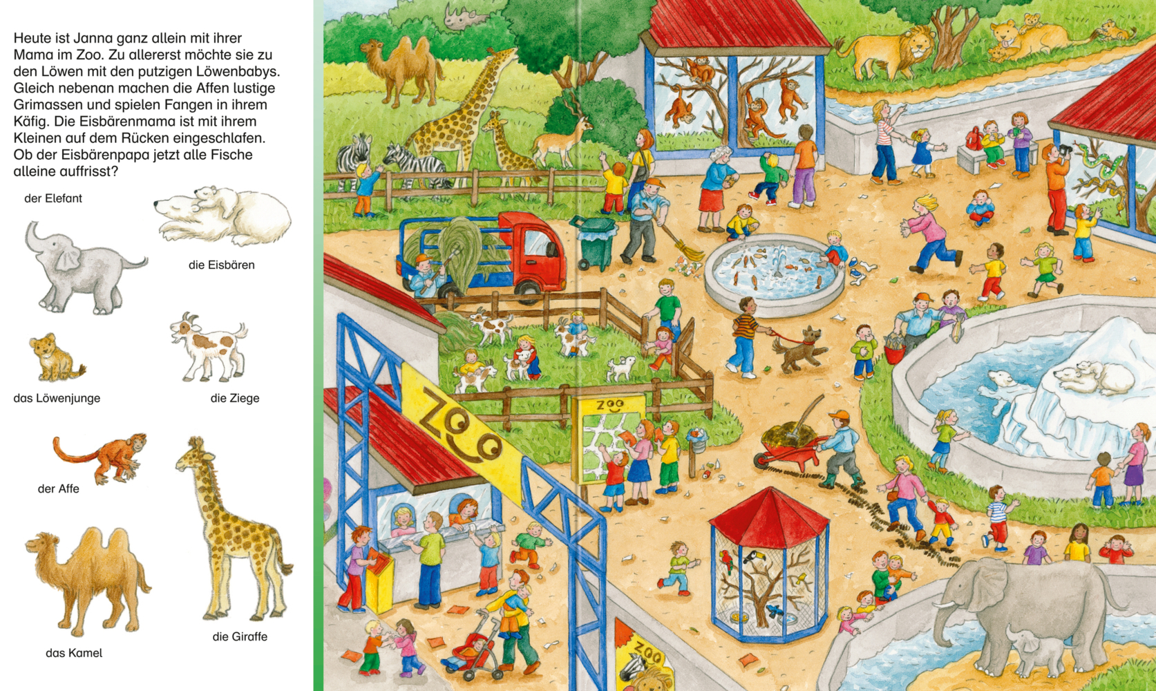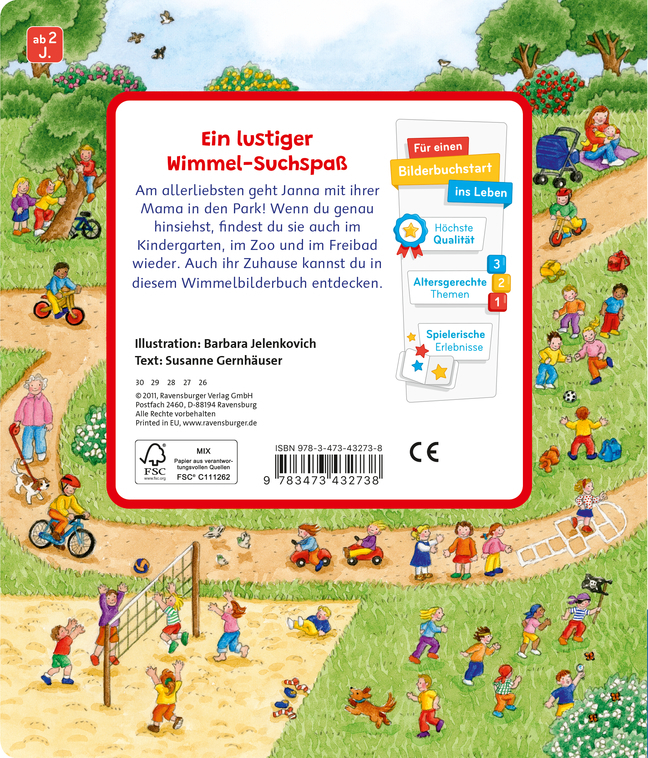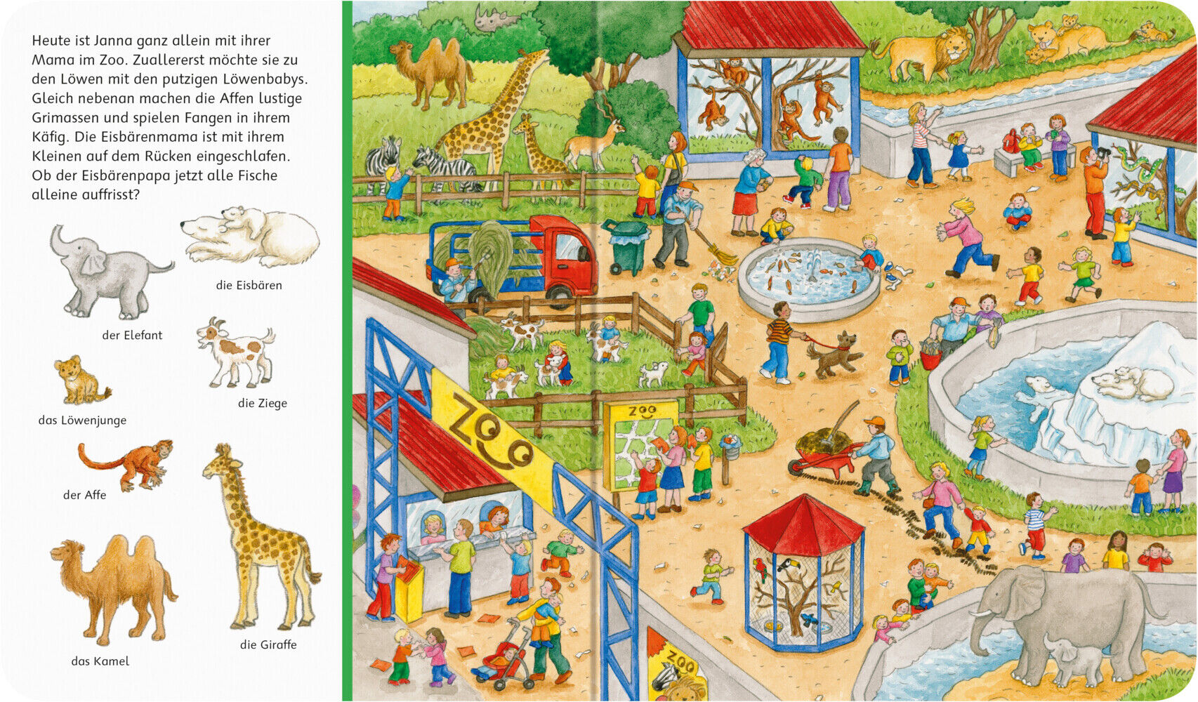 Ravensburger 43273 Sachen suchen: Meine Wimmelbilder Pappbilderbuch über 5 Euro Am allerliebsten geht Jana mit ihrer Mama auf den Spielplatz in den Park. Aber wenn du genau hinsiehst, findest du Jana auch im Kindergarten, im Zoo und im Freibad. Sogar ihr Zuhau...