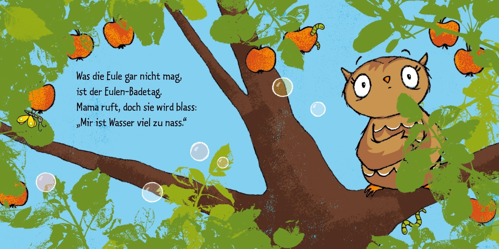Die kleine Eule erlebt ihr nächstes großes Abenteuer, als sie widerwillig einem Badeabend zustimmt. Anfangs skeptisch gegenüber dem Wasser, versucht ihre Mutter sie mit verschiedenen Spielzeugen und viel Badeschaum zu überzeugen. Die Erzählung nimmt eine witz...