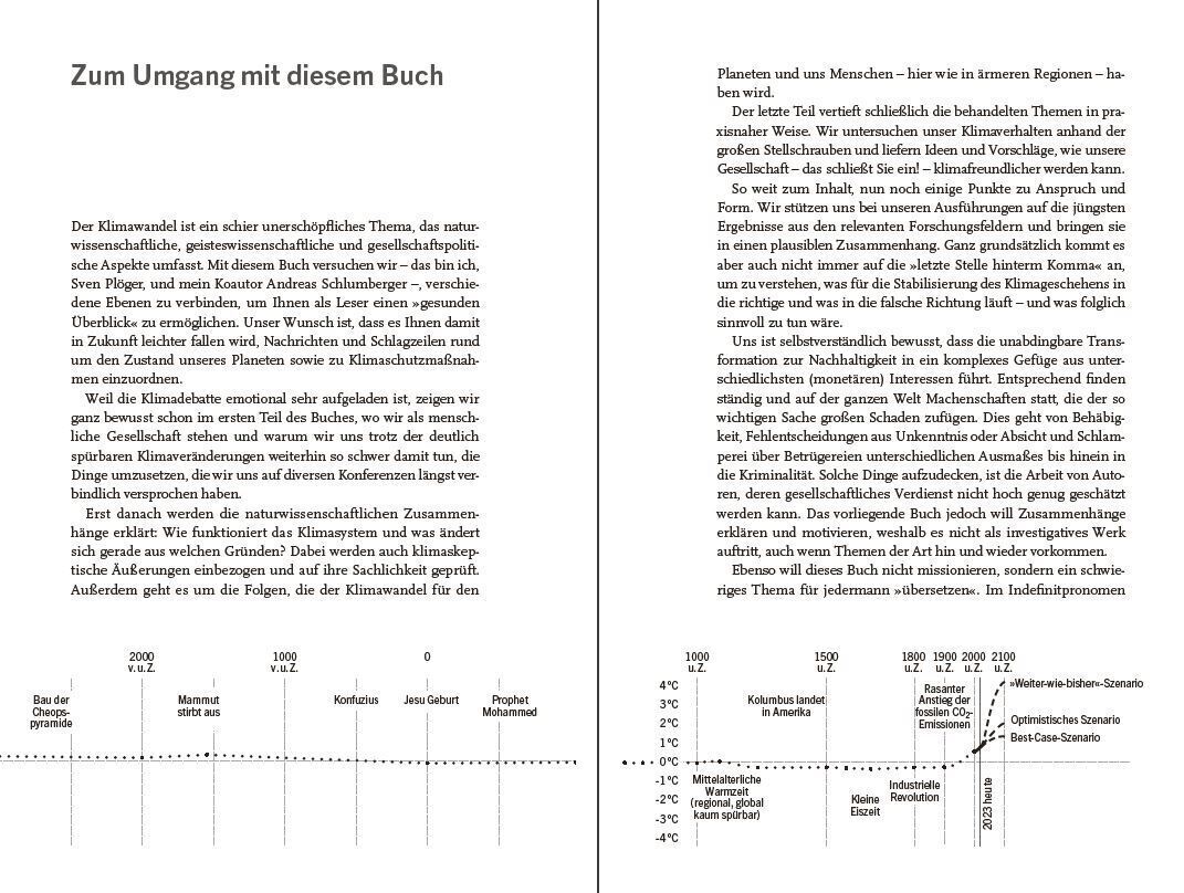 Inhalt Vorwort 7 Zum Umgang mit diesem Buch 11 Eine ehrliche Bestandsaufnahme 13 Kann uns die Coronakrise beim Umgang mit dem Klimawandel helfen? 14 Nur Wetter oder schon Klima? 19 Der Blick aufs große Ganze 23 Warum wir viel wissen, aber nicht danach handeln 34 Muss nicht auch jeder selbst etwas ändern? 57 Es braucht Regeln hart, aber ehrlich 63 Den Klimawandel verstehen 77 Wetter ist nicht gleich Klima 78 Von Projektionen und Prognosen 83 Der Treibhauseffekt und das Leben auf der Erde 87 Vom Urknall zum Menschen einmal durch die Klimageschichte 93 Die Rolle der Treibhausgase und des Menschen 114 Was unser Klima bestimmt von der Arktis bis zum Ozon 119 Den Klimawandel vermitteln 169 Nicht missionieren, sondern informieren 170 Kritischen Äußerungen begegnen und daraus lernen 171 Herausforderung für die Medien 189 Die Folgen des Klimawandels 199 Welche Klimaveränderungen kommen auf uns zu? 200 Klima, Krieg und Frieden 212 Der Wettlauf zum Klimaziel was jetzt zu tun ist 219 Kohlenstoffsenken schützen, Kohlenstoffquellen schließen 220 Die Bedeutung der Wälder 225 Die Meere als größte Kohlenstoffsenken 236 Rettet die Moore! 244 Energieverbrauch runter, Grünstrom rauf 251 Stromfresser Internet 261 Um die Welt um jeden Preis? 270 Richtig einheizen und mit dem Klima warm werden 287 Aufgetischt! Unsere Ernährung 295 Klima und Gesundheit ein Gastbeitrag von Eckart von Hirschhausen 303 Wie wollen wir die Welt? 310 Danksagung 312 Sachregister 314