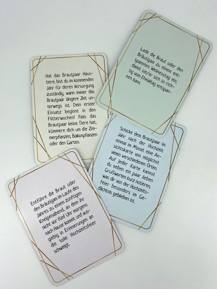 Dieses Kartendeck enthält das perfekte Hochzeitsgeschenk: persönlich, originell und einzigartig!Denn auf jeder Karte findest du eine besondere Aufgabe für das erste Ehejahr der frisch Vermählten, die du am Tag der Hochzeit an die Gäste verteilen kannst. Das ka...