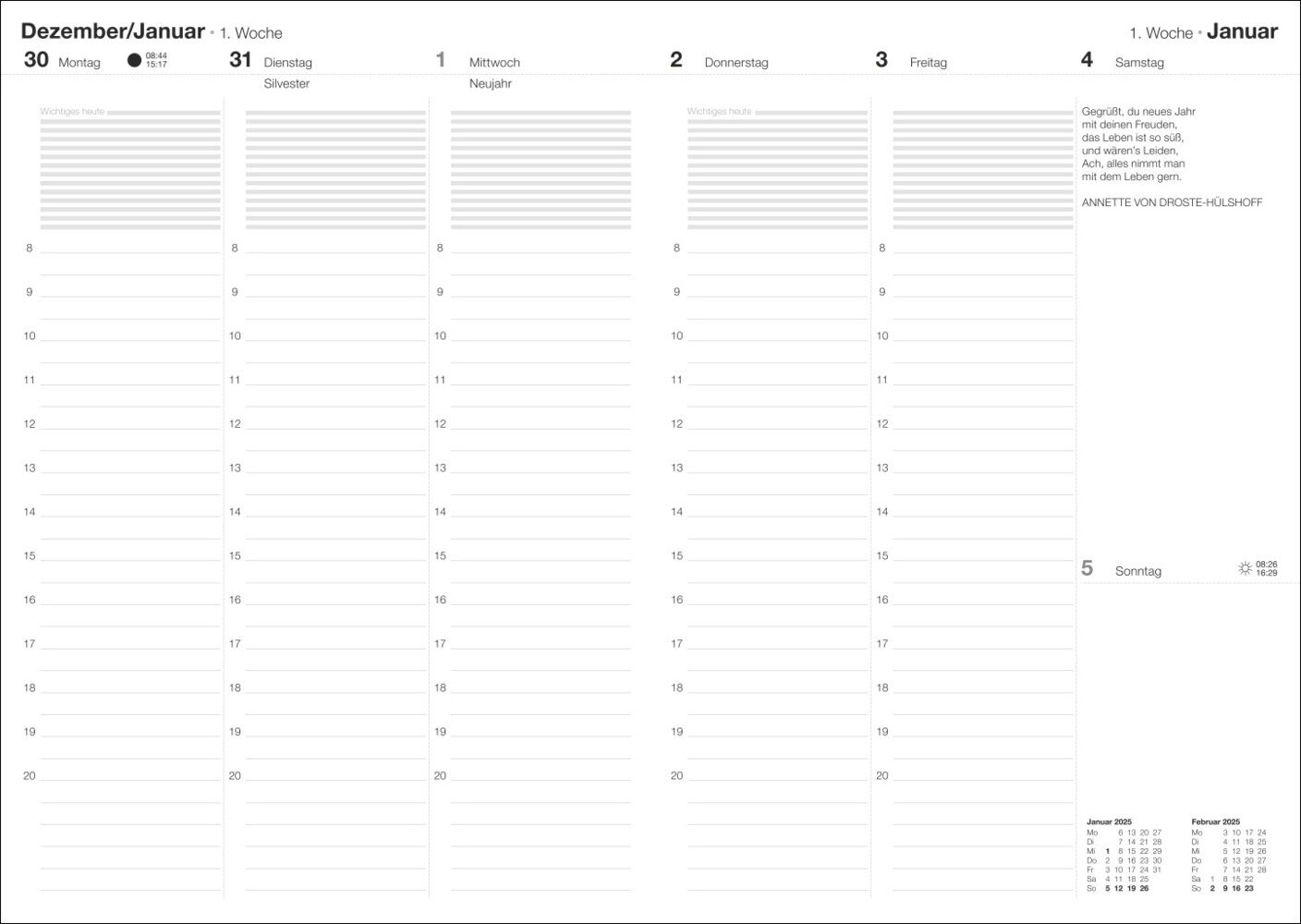 Klassisch zeitloser Terminplaner mit hochwertigem schwarzem Kunstledereinband. Übersichtliche Aufteilung mit viel Platz für Eintragungen, praktischen Infos für den Alltag und spannenden Zitaten. Inkl. Lesebändchen.