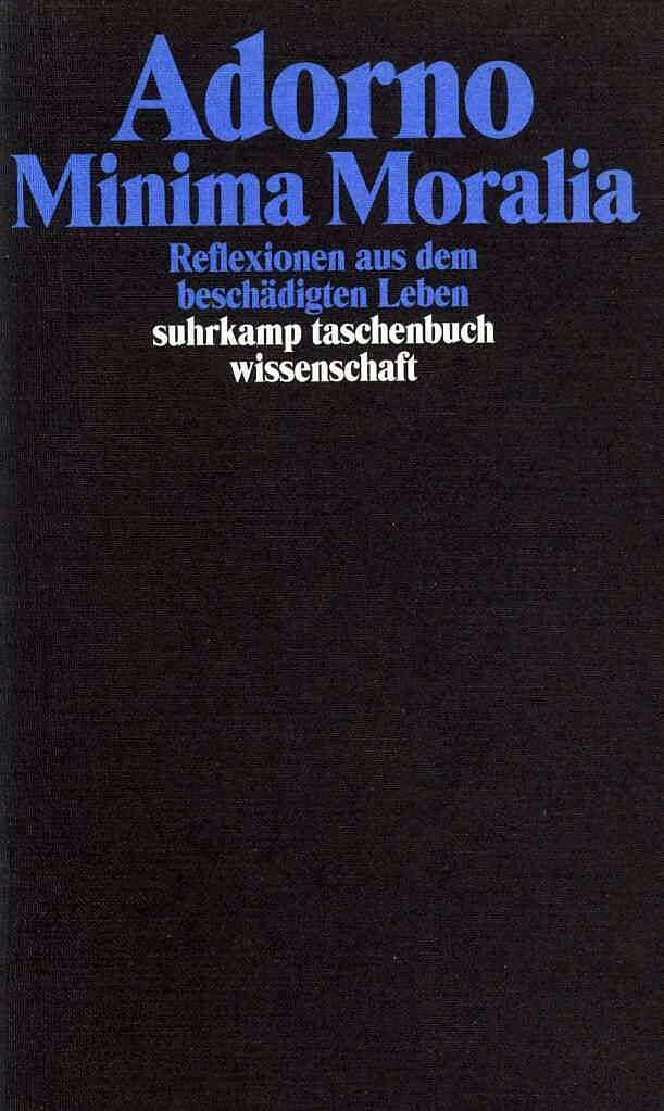 Minima MoraliaReflexionen ans dem beschädigten LebenZueignungErster Teil:Für Marcel Proust / Rasenbank / Fisch im Wasser / Letzte Klarheit / Herr Doktor, das ist schön von Euch / Antithese / They, the people / Wenn dich die bösen Buben locken / Vor allem eins,...Minima MoraliaReflexionen ans dem beschädigten LebenZueignungErster Teil:Für Marcel Proust / Rasenbank / Fisch im Wasser / Letzte Klarheit / Herr Doktor, das ist schön von Euch / Antithese / They, the people / Wenn dich die bösen Buben locken / Vor allem eins, mein Kind / Getrennt-vereint / Tisch und Bett / Inter pares / Schutz, Hilfe und Rat / Le bourgeois revenant / Le nouvel avare / Zur Dialektik des Takts / Eigentumsvorbehalt / Asyl für Obdachlose / Nicht anklopfen / Struwwelpeter / Umtausch nicht gestattet / Kind mit dem Bade / Plurale tantum / Tough Baby / Nicht gedacht soll ihrer werden / English spoken / On parle français / Paysage / Zwergobst / Pro domo nostra / Katze aus dem Sack / Die Wilden sind nicht bessere Menschen / Weit vom Schuß / Hans-Guck-in-die-Luft / Rückkehr zur Kultur / Die Gesundheit zum Tode / Diesseits des Lustprinzips / Aufforderung zum Tanz / Ich ist Es / Immer davon reden, nie daran denken / Drinnen und draußen / Gedankenfreiheit / Bangemachen gilt nicht / Für Nach-Sokratiker / »Wie scheint doch alles Werdende so krank« / Zur Moral des Denkens / De gustibus est disputandum / Für Anatole France / Moral und Zeitordnung / LückenZweiter Teil:Hinter den Spiegel / Woher der Storch die Kinder bringt / Schwabenstreiche / Die Räuber / Darf ich's wagen / Stammbaumforschung / Ausgrabung / Die Wahrheit über Hedda Gabler / Seit ich ihn gesehen / Ein Wort für die Moral / Berufungsinstanz / Kürzere Ausführungen / Tod der Unsterblichkeit / Moral und Stil / Kohldampf / Melange / Unmaß für Unmaß / Menschen sehen dich an / Kleine Leute / Meinung des Dilettanten / Pseudomenos / Zweite Lese / Abweichung / Mammut / Kalte Herberge / Galadiner / Auktion / Über den Bergen / Intellectus sacrificium intellectus / Diagnose / Groß und klein / Drei Schritt vom Leibe / Vizepräsident / Stundenplan / Musterung / Manschen klein / Ringverein / Dummer August / Schwarze Post / Taubstummenanstalt / Vandalen / Bilderbuch ohne Bilder / Intention und Abbild /