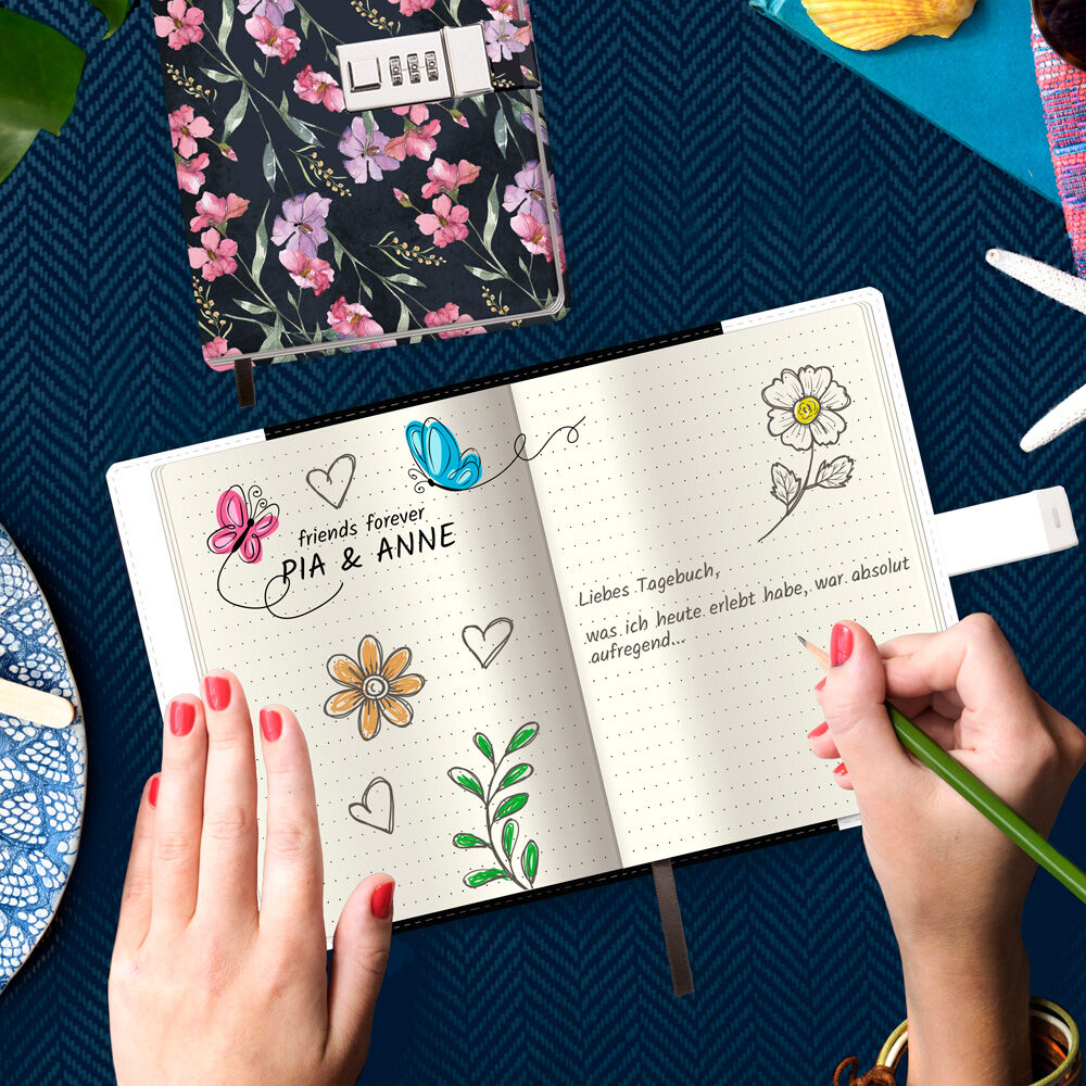 Das Tagebuch im charmanten Blumen-Design eignet sich perfekt, um Gedanken und Gefühle niederzuschreiben und zu ordnen. Die gepunkteten Seiten eignen sich besonders gut für eine individuelle Gestaltung, während ein Schloss mit Zahlencode dafür sorgt, dass alle ...