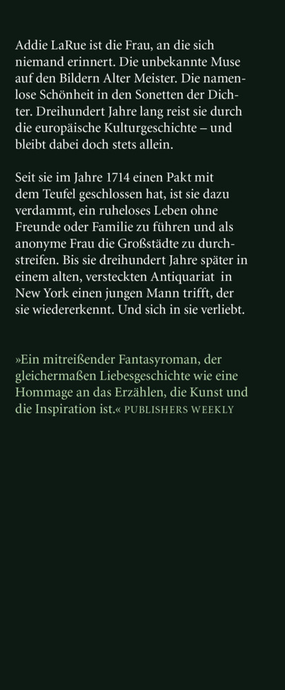 »Das unsichtbare Leben der Addie LaRue« ist ein großer historischer Fantasy-Roman, eine bittersüße Liebesgeschichte - und eine Hommage an die Kunst und die Inspiration. Addie LaRue ist die Frau, an die sich niemand erinnert. Die unbekannte Muse auf den Bilder...