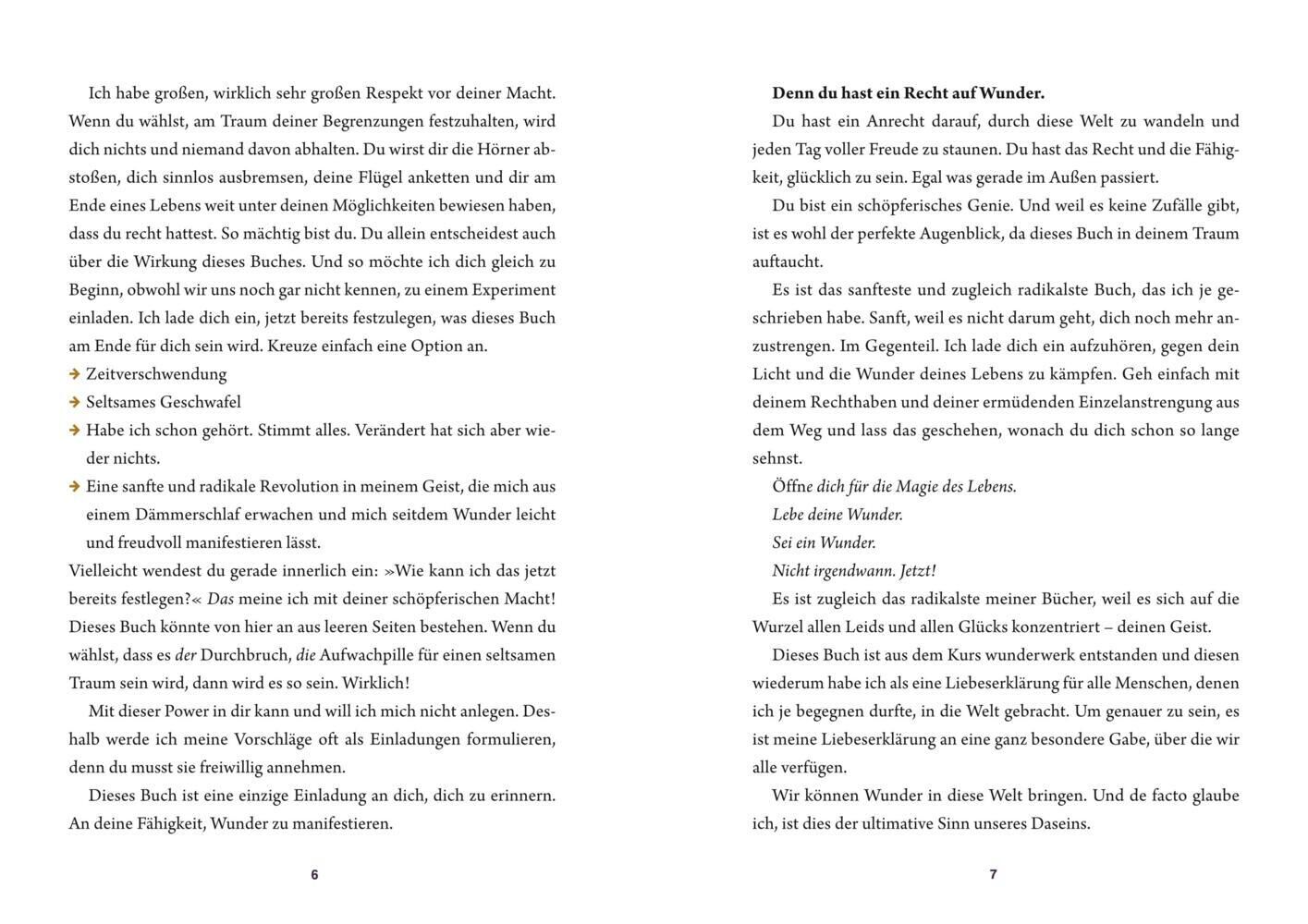 **wunderwerk ist das sanfteste und zugleich radikalste Buch, das ich je geschrieben habe. Sanft, weil es nicht darum geht, dich noch mehr anzustrengen. Im Gegenteil. Ich lade dich ein, aufzuhören, gegen dein Licht und die Wunder deines Lebens zu kämpfen. Geh einfach mit deinem Rechthaben und deiner ermüdenden Einzelanstrengung aus dem Weg und lass das geschehen, wonach du dich schon so lange sehnst. Öffne dich für die Magie des Lebens. Es ist zugleich das radikalste meiner Bücher, weil es sich auf die Wurzel allen Leids und allen Glücks konzentriert - deinen Geist.