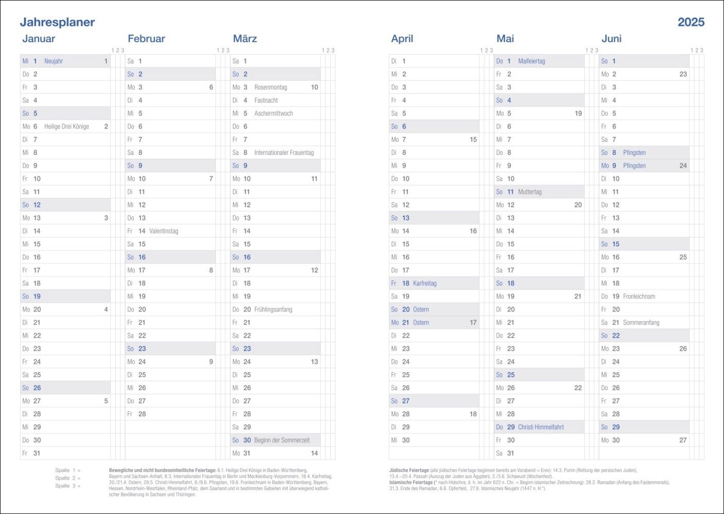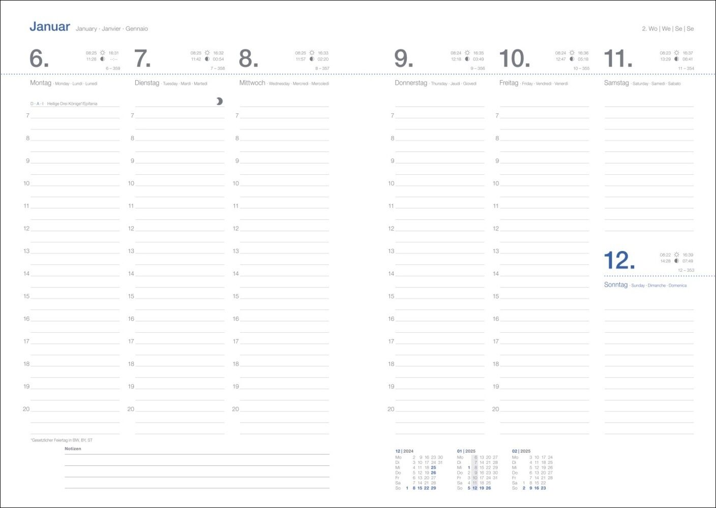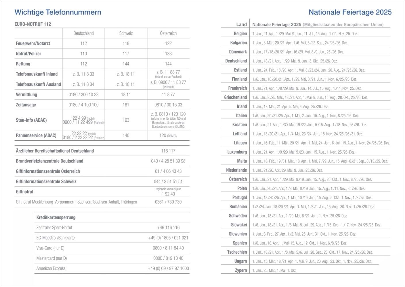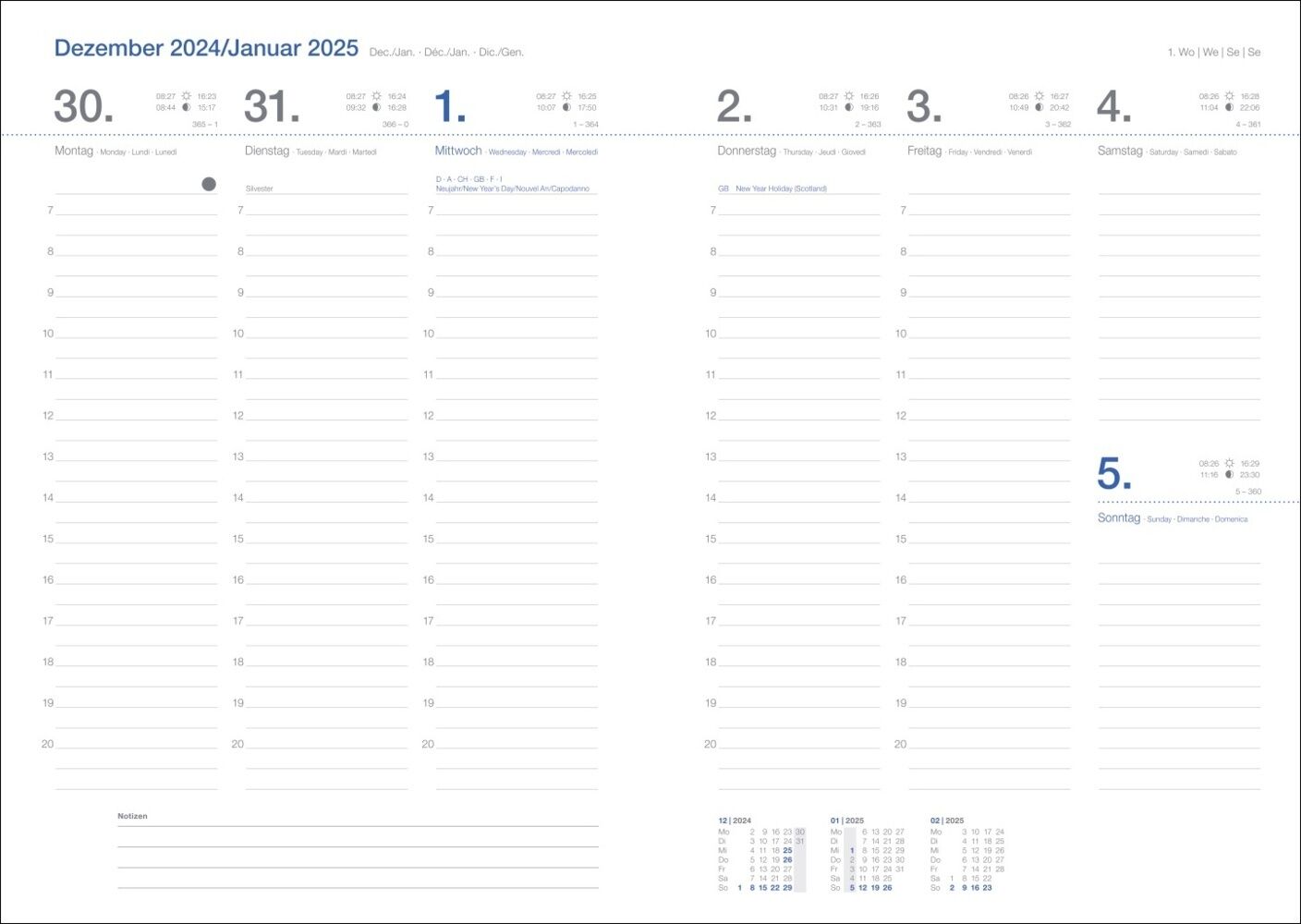Schicker Terminplaner mit goldenem Hardcover in Alu-Optik und Spiralbindung. Innen mit übersichtlichem viersprachigem Kalendarium und viel Platz für Eintragungen.Sprachen: Deutsch, Englisch, Französisch, Italienisch