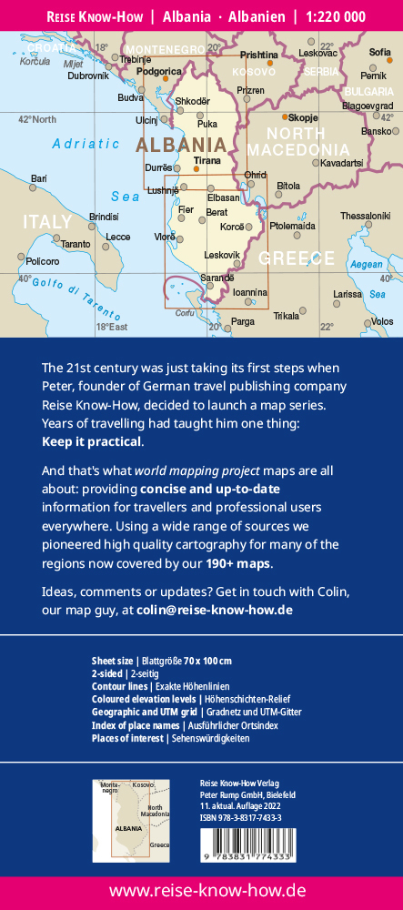 Hochreißfeste und 100% wasserfeste Landkarte "Albanien" aus der Serie world mapping project, erschienen im Reise Know-How Verlag. Reise Know-How Landkarten zeichnen sich durch besonders stabiles Kunststoffpapier aus, das beschreibbar ist wie Papier, sogar mit ...