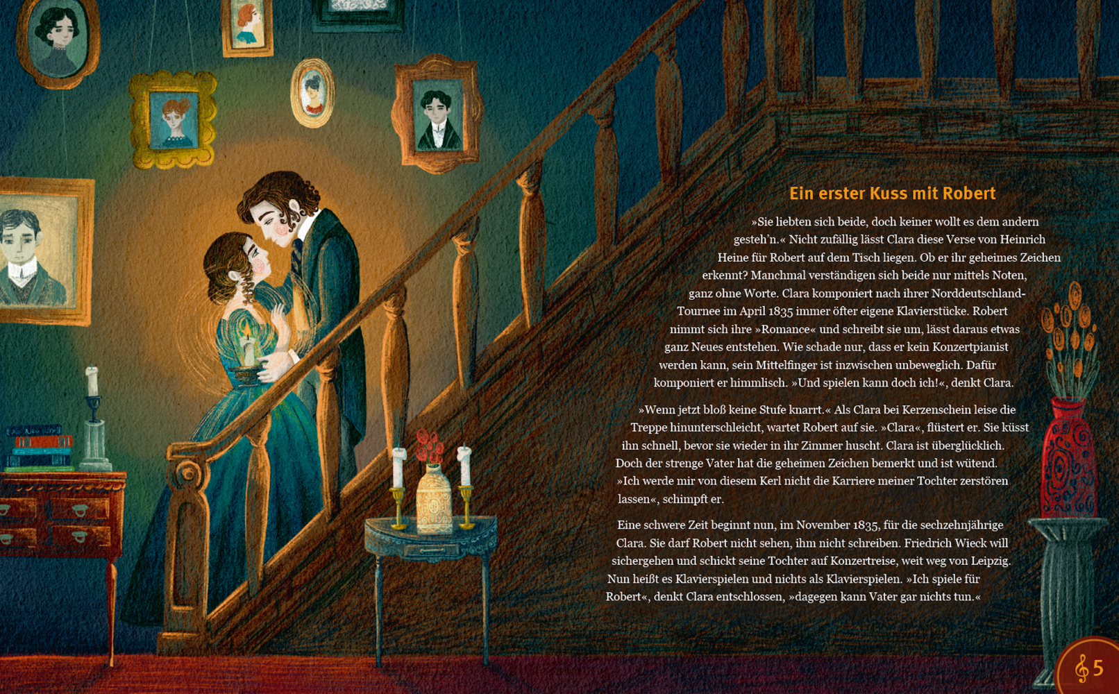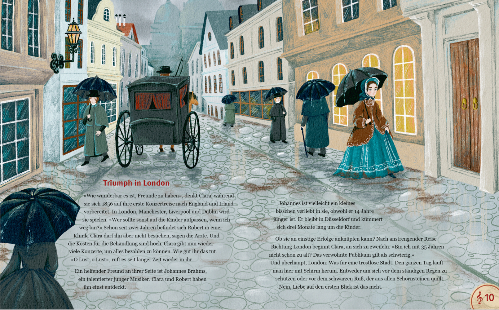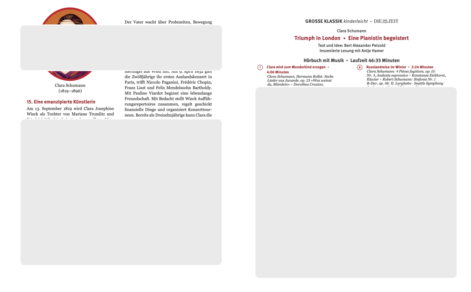 Am 13. September 1819 wird Clara Josephine Wieck in Leipzig geboren. Claras Mutter stammt aus einer Musikerfamilie und ihr Vater ist Inhaber eines Musikalienverleihs, das Haus Wieck gilt als eine der ersten Adressen für musikalische Ausbildung. Die Trennung der Eltern ist schmerzhaft, Clara muss ihre Mutter verlassen. Sie soll der neue Mozart werden und erhält Unterricht im Komponieren, Violinspiel und Gesang. Der Vater wacht über Probezeiten und Ernährung. Am 20. Oktober 1828 hat sie ihren ersten öffentlichen Auftritt im Leipziger Gewandhaus. Am 9. April 1832 gibt die Zwölfjährige ihr erstes Auslandskonzert in Paris, trifft Niccolo Paganini und Frédéric Chopin. Nach gerichtlich erstrittener Ehe und künstlerisch produktiven Jahren stirbt ihr Mann Robert Schumann 1856. Fortan wird Clara Schumann als freischaffende Künstlerin ein selbstbestimmteres Leben führen. 1853 beginnt eine innige Freundschaft mit dem Komponisten Johannes Brahms. Über die Jahre wird sie in London zum festen Bestandteil des Musiklebens und zum bewunderten Star. Am 12. März 1891 gibt sie ein letztes Konzert in Frankfurt, sie stirbt am 19. Mai 1896 und wird auf dem Alten Friedhof Bonn in der Ehrengruft neben Robert Schumann beigesetzt. Autor und Herausgeber dieser ZEIT-Edition ist Bert Alexander Petzold. Er hat Verlagswirtschaft studiert, als Rundfunkredakteur zahlreiche Beiträge und Features verfasst und ist in leitenden Positionen u. a. für Eichborn, Faber & Faber und Deutsche Grammophon/Universal Music im internationalen Umfeld tätig gewesen. Als Produzent hat er über 800 Hörbücher und Hörspiele veröffentlicht, prämiert u. a. mit dem Deutschen Hörbuchpreis und dem Echo-Klassik. Seine Passion sind Literatur und Musik gleichermaßen. Als Verleger des Leipziger Amor Verlags hat er u. a. die ZEIT-Editionen »Große Oper für kleine Hörer«, »Märchen-Klassik für kleine Hörer«, »Der Ring des Nibelungen für kleine Hörer« konzipiert und herausgegeben sowie Hörspiele für Figuren der Toniebox in deutscher und englischer Sprache produziert. Das Talent der Illustratorin Lola Svetlova ist seit Kindertagen gefördert worden. An einer Kunstfachschule hat sie eine Zeichenausbildung erhalten, später Kinderpsychologie studiert, viele Jahre in Bangkok/Thailand gelebt und seitdem zahlreiche Kinderbücher mit ihrem humorvollen und prägnanten Stil illustriert. Lola Svetlova lebt in Tomsk/Sibirien. Die mehrfach prämierte Schauspielerin Antje Hamer ist seit vielen Jahren regelmäßig auf Theaterbühnen u. a. der Opernwerkstatt am Rhein, in Kinofilmen und in TV-Serien oder im Tatort zu sehen. Sie hat zahlreiche Hörbücher eingelesen und Veranstaltungen für Kinder moderiert. Antje Hamer lebt mit ihrer Familie in Köln.