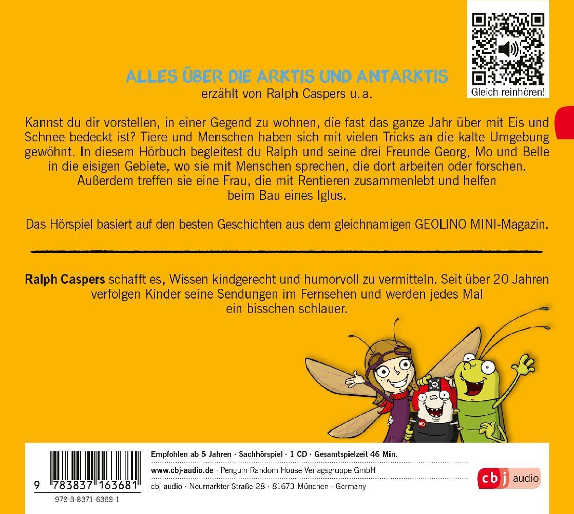 Könnt ihr euch vorstellen in einer Gegend zu wohnen, die fast das ganze Jahr über mit Eis und Schnee bedeckt ist? Ralph und seine drei Freunde Georg, Mo und Belle sprechen mit Menschen, die in den eisigen Gebieten arbeiten und forschen. Außerdem treffen sie ein Mädchen, das mit Rentieren zusammenlebt und helfen beim Bau eines Iglus. Mit viel Humor und immer der richtigen Portion Ernsthaftigkeit vermittelt Ralph Caspers im neuen Hörspiel zu den beliebten GEOLINI MINI-Heften seinen kleinen Zuhörer*innen Alles über die Arktis und Antarktis.