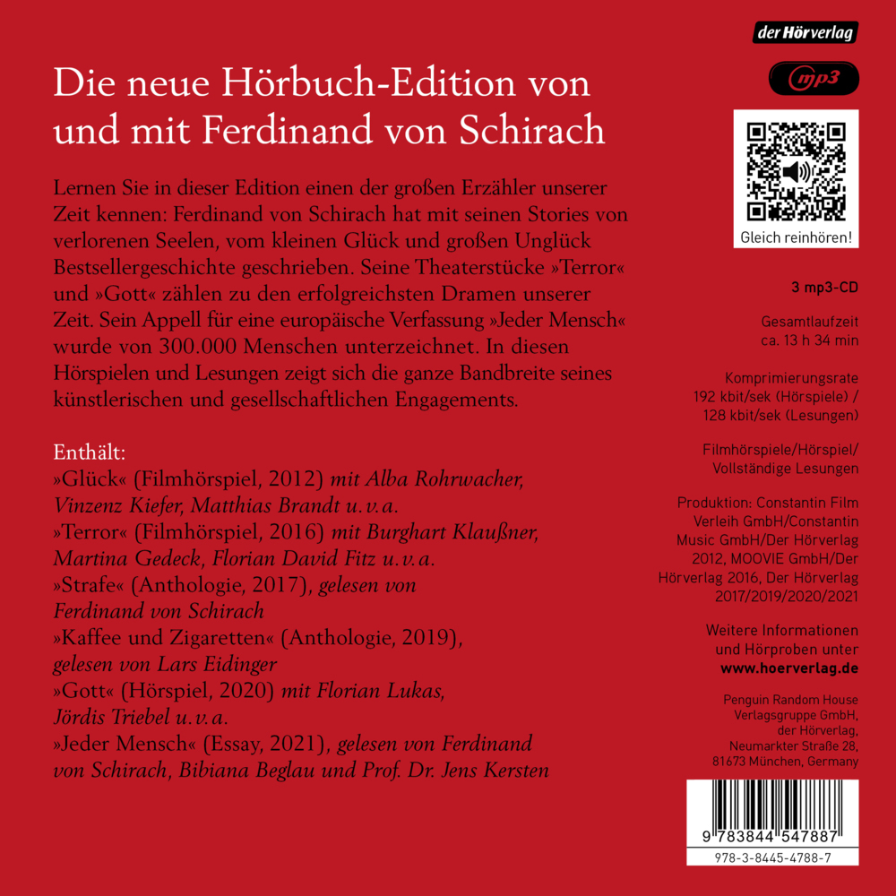 Lernen Sie in dieser Edition einen der großen Erzähler unserer Zeit kennen: Ferdinand von Schirach hat mit seinen Stories von verlorenen Seelen, vom kleinen Glück und großen Unglück Bestsellergeschichte geschrieben. Seine Theaterstücke »Terror« und »Gott« zählen zu den erfolgreichsten Dramen unserer Zeit. Sein Appell für eine europäische Verfassung »Jeder Mensch« wurde von 300.000 Menschen unterzeichnet. In diesen Hörspielen und Lesungen zeigt sich die ganze Bandbreite seines künstlerischen und gesellschaftlichen Engagements.