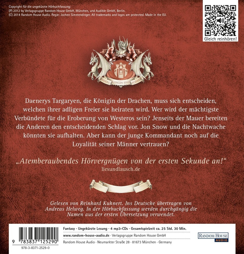 UNSERE KLINGEN SIND SCHARF Daenerys Targaryen, die Königin der Drachen, muss sich entscheiden, welchen ihrer adligen Freier sie heiraten wird. Wer wird der mächtigste Verbündete für die Eroberung von Westeros sein? Es ist eine rein politische Entscheidung, den...| 1 | Das Lied von Eis & Feuer - Ein Tanz mit Drachen (Band 10) | 00:00 |