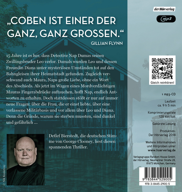 In Deinem Namen (MP3) Bierstedt,Detlef "Coben ist einer der ganz, ganz Grossen." Gillian Flynn 15 Jahre ist es her, dass Detective Nap Dumas seinen Zwillingsbruder Leo verlor. Damals wurden Leo und dessen Freundin Diana unter mysteriösen Umständen to...| 1 | In deinem Namen | 09:05 |