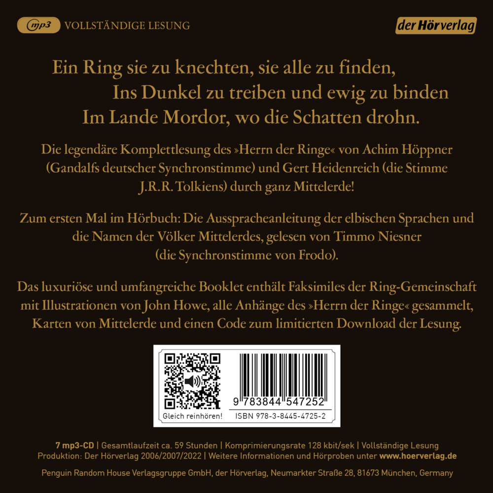 Limitierte Auflage in luxuriöser Ausstattung mit 300 Seiten Booklet und goldenen CDs, zusätzlicher Code zum limitierten Downloaden der Komplettlesung Die legendäre Komplettlesung des »Herrn der Ringe« von Achim Höppner (Gandalfs deutscher Synchronstimme) und Gert Heidenreich (Die Stimme J.R.R. Tolkiens) mit über 57 Stunden durch ganz Mittelerde Das umfangreiche Booklet enthält Faksimiles der Ring-Gemeinschaft mit Illustrationen von John Howe, alle Anhänge des »Herrn der Ringe« gesammelt und Karten von Mittelerde Zum ersten Mal im Hörbuch: Die Ausspracheanleitung der elbischen Sprachen und die Namen der Völker Mittelerdes gelesen von Timmo Niesner (Die Synchronstimme von Frodo) Zur Serie auf Amazon Prime im September 2022 Die legendären Stimmen Mittelerdes in einer limitierten und einmaligen Ausgabe: Achim Höppner, Gert Heidenreich und Timmo Niesner sind die großen Stimmen der Ring-Gemeinschaft und der Elbischen Sprache! Enthält: - Komplettlesung - luxuriöses Booklet mit 300 Seiten inklusive aller Anhänge - Karten Mittelerdes und Faksimiles der Ring-Gemeinschaft - Bonus-CD: elbisches Wörterbuch zum ersten Mal im Hörbuch - Inklusive Download-Code