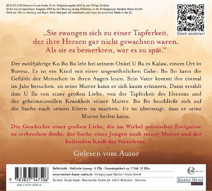 Das Finale der bewegenden Burma-Trilogie Der zwölfjährige Ko Bo Bo lebt bei seinem Onkel U Ba in Kalaw, einem Ort in Burma. Er ist ein Kind mit einer ungewöhnlichen Gabe: Bo Bo kann die Gefühle der Menschen in ihren Augen lesen. Sein Vater kommt ihn einmal im ...| 1 | Das Gedächtnis des Herzens | 00:13 | |