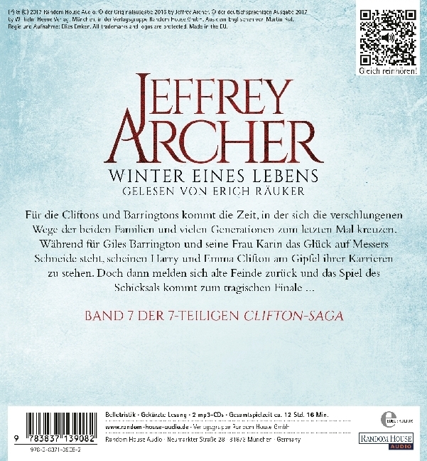 (Clifton 7/MP3)Winter Eines Lebens Raeuker,Erich Das große Finale der Clifton-Saga! Für die Cliftons und Barringtons kommt die Zeit, in der sich die verschlungenen Wege der beiden Familien und Generationen zum letzten Mal kreuzen. Während Giles Barrington die ...| 1 | Winter Eines Lebens | 00:00 |