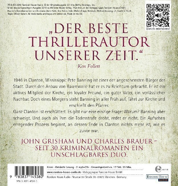 Wenn aus der Wahrheit Böses wächst - der neue große Roman von John Grisham 1946 in Clanton, Mississippi: Pete Banning ist einer der angesehensten Bürger der Stadt. Durch den Anbau von Baumwolle hat er es zu Reichtum gebracht. Er ist ein aktives Mitglied der Ki...| 1 | Das Bekenntnis | 00:00 |