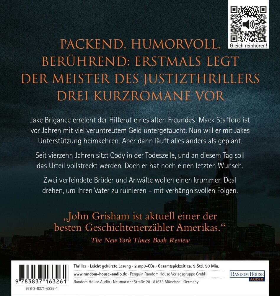 Packend, humorvoll, berührend Erstmals legt der Meister des Justizthrillers drei Kurzromane vor: Vor drei Jahren hat der Anwalt Mack Stafford eine große Summe Geld veruntreut und ist untergetaucht. Nun liegt seine Frau im Sterben, und Jake Brigance soll ihm da...